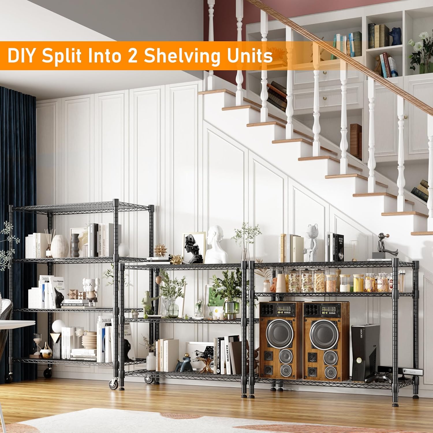 - 【ADJUSTABLE HEIGHT】Each layer of the wire shelf can be adjusted to match the height of your items, optimizing your storage space. Additionally, you can join two storage racks to form a wider unit, providing extra width to meet your needs. No matter your requirements, you can assemble a shelf configuration that fits just right