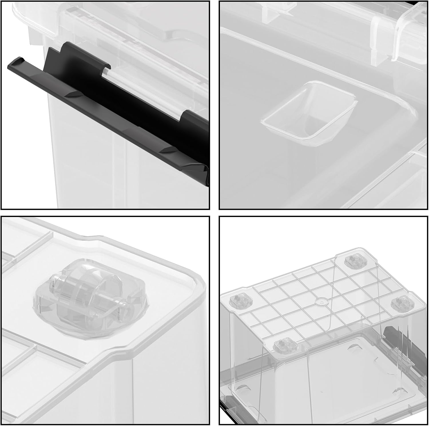 • The securely locking lid keeps items safe and allows bins to be stacked on top of each other, with 4 wheels at the bottom to make it easier to move