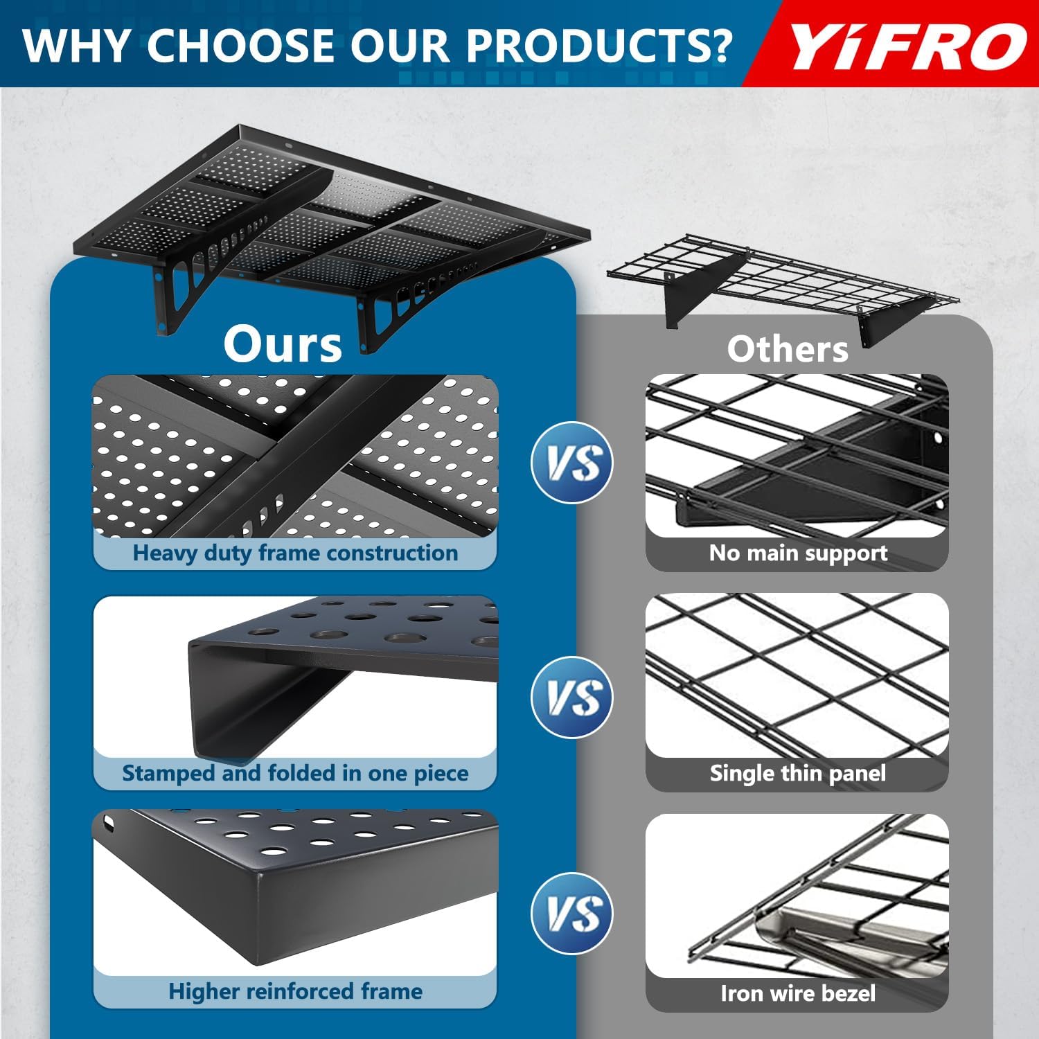 • HEAVY DUTY CONSTRUCTION: YIFRO garage wall shelving takes its cues from architectural frame construction, with a 1.5x4 ft individual bracket load capacity of 250 lbs. and a total of 500 lbs. for 2 shelves, which makes it easy to store most of the items in your garage.