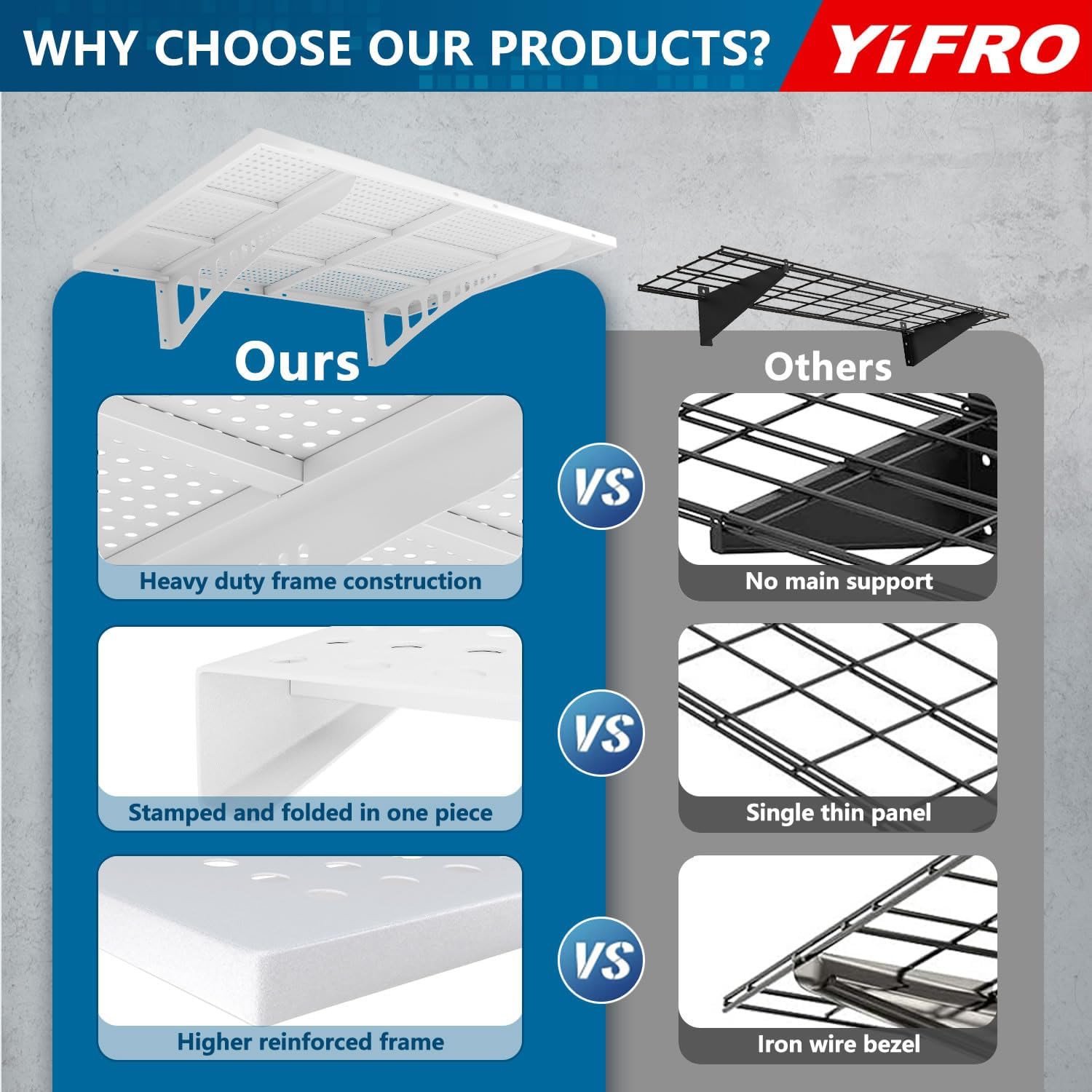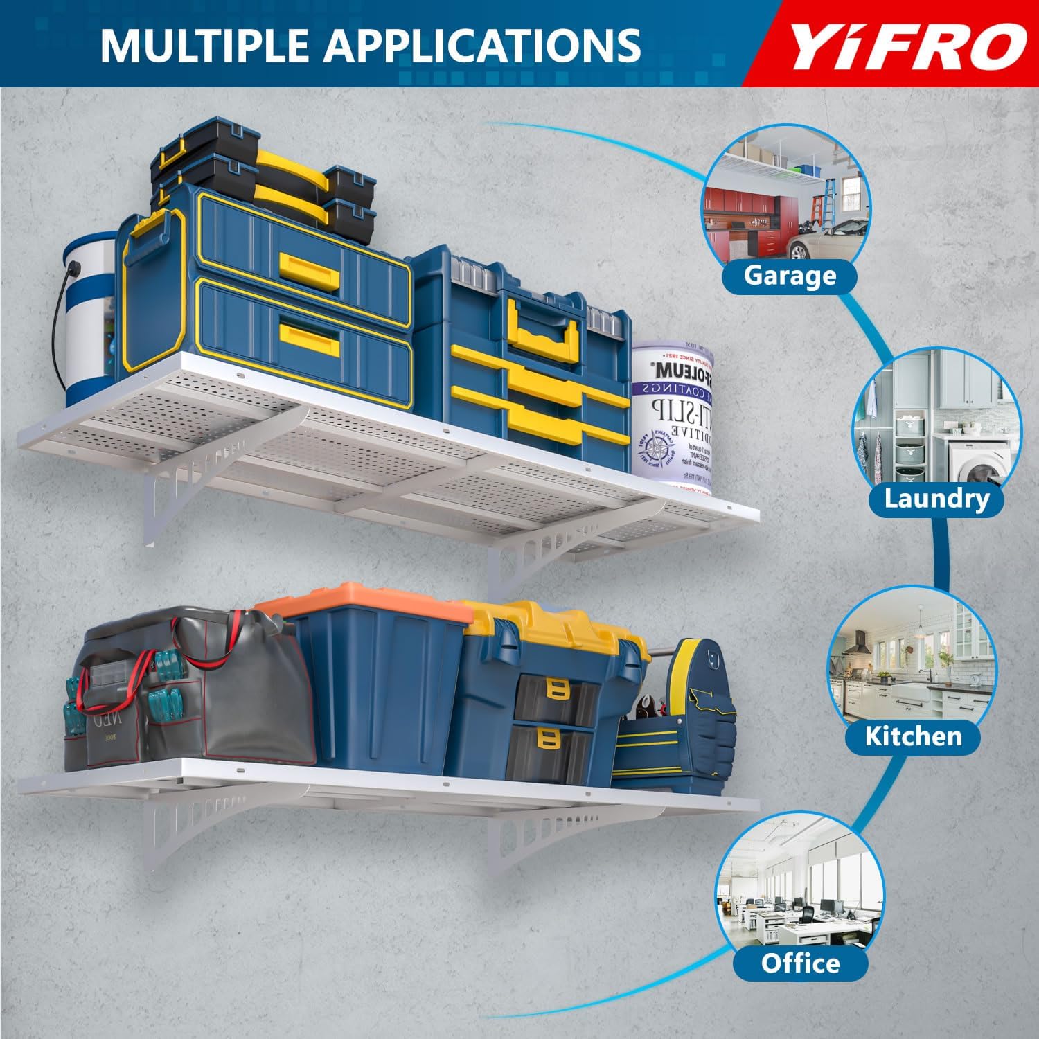 • HEAVY DUTY CONSTRUCTION: YIFRO garage wall shelving takes its cues from architectural frame construction, with a 1.5x4 ft individual bracket load capacity of 250 lbs. and a total of 1000 lbs. for 4 shelves, which makes it easy to store most of the items in your garage.