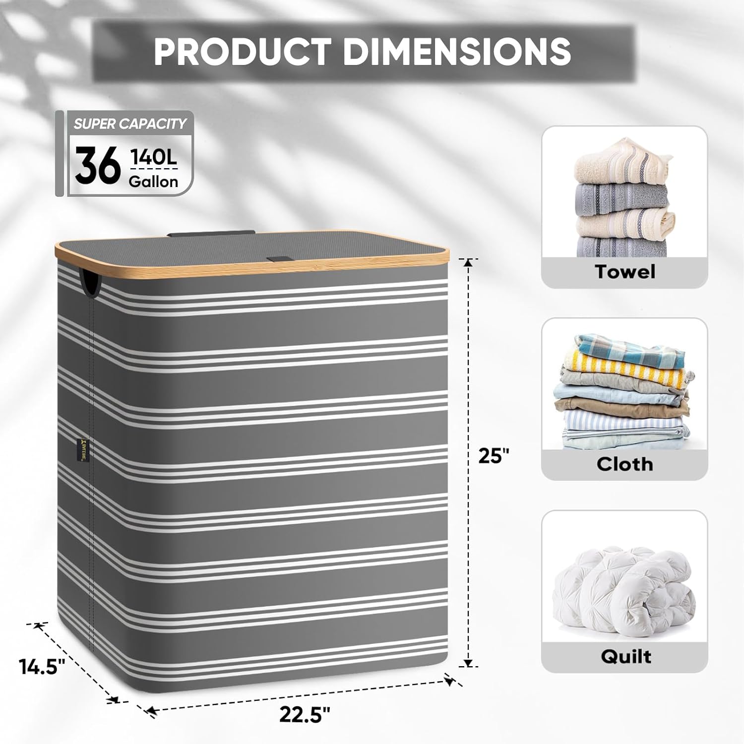 BALEINE Laundry Hamper with Lid, Tall Laundry Baskets with Bamboo Pull Handles, Large Laundry Bin with Internal Support (36 Gal/140L, Grey Pinstripe)