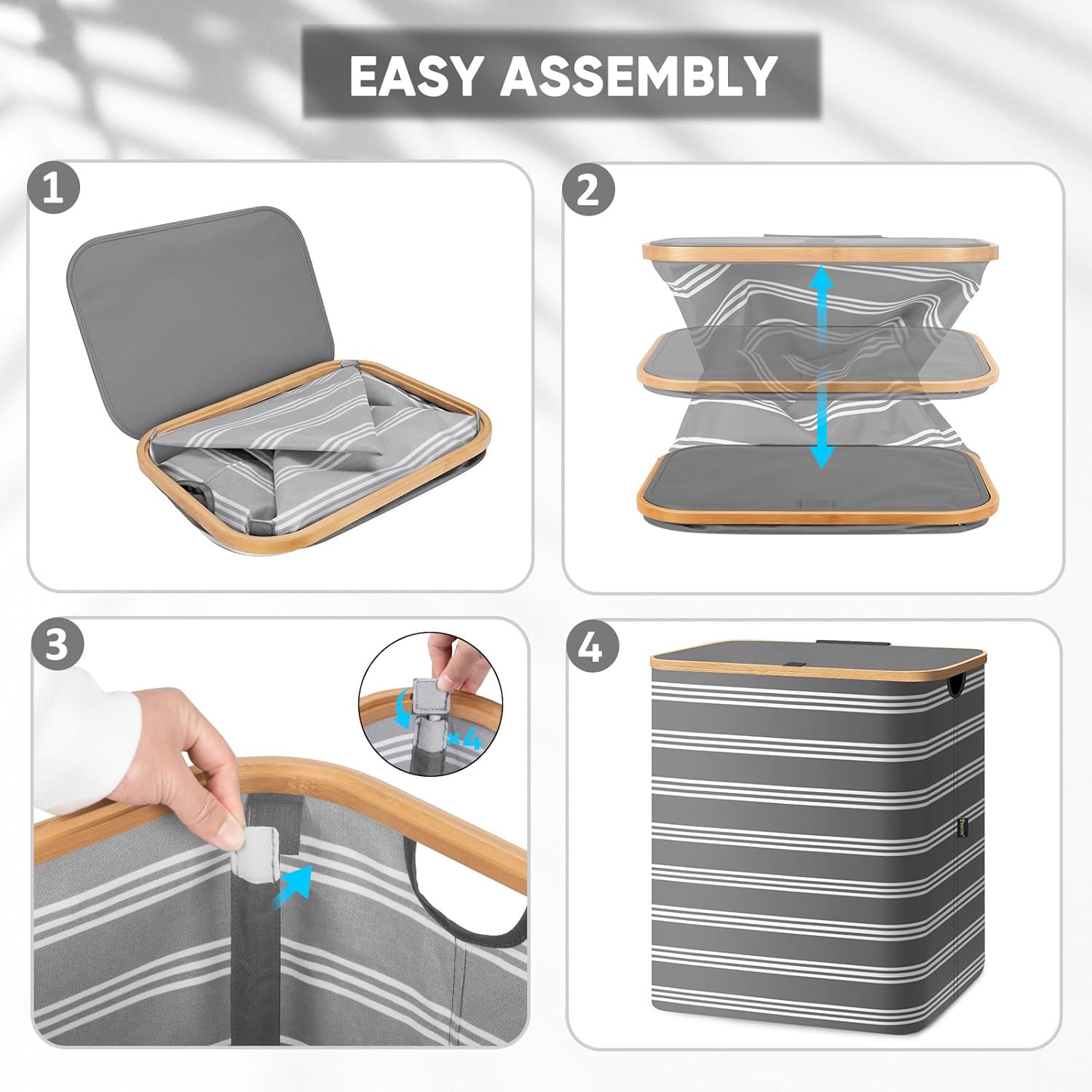 • [SLEEK DESIGN AND PREMIUM MATERIALS] Our laundry basket with lid adds a touch of elegance to any room. The natural bamboo rim gives it a timeless appeal, while the sturdy internal support structure ensures it maintains its shape, even when empty.