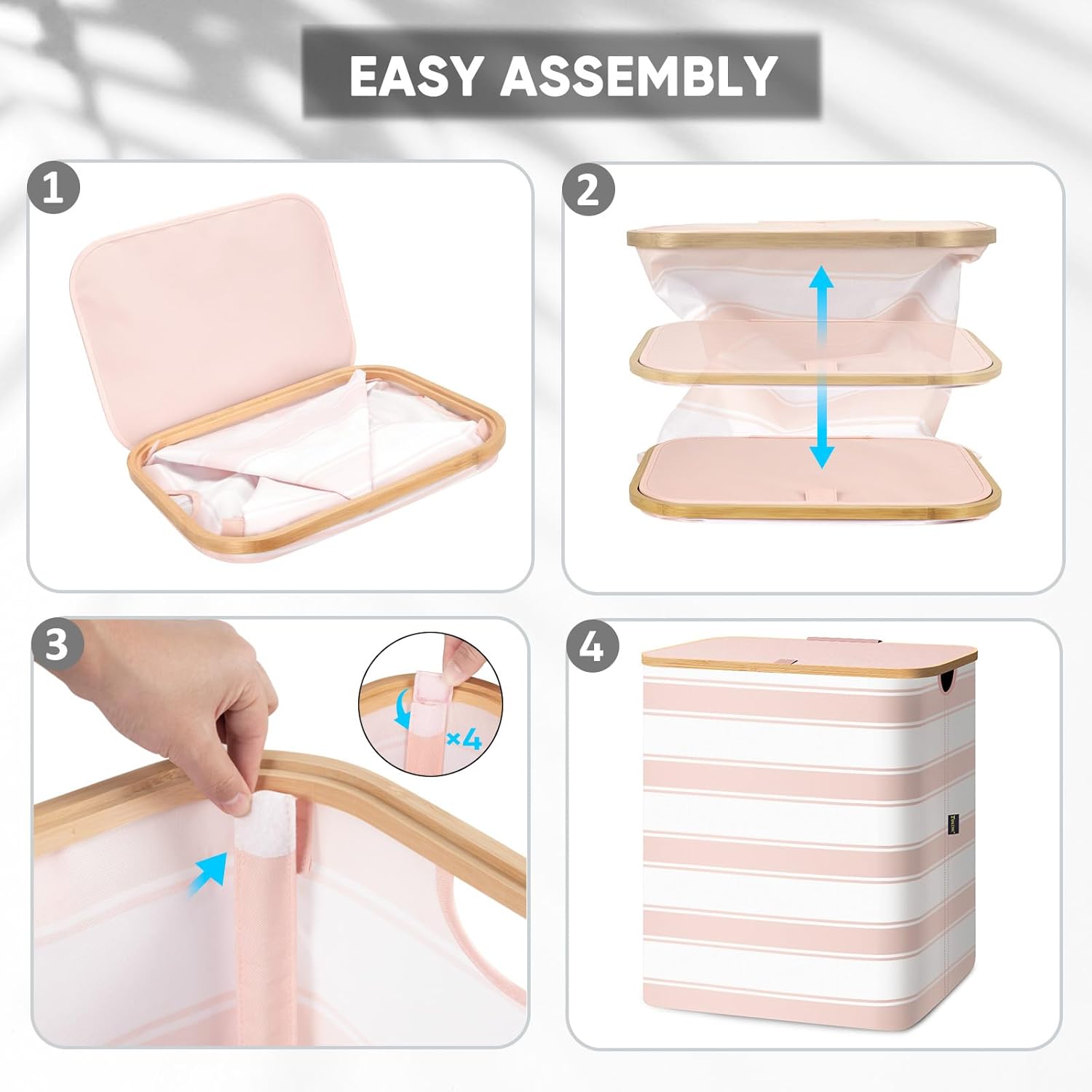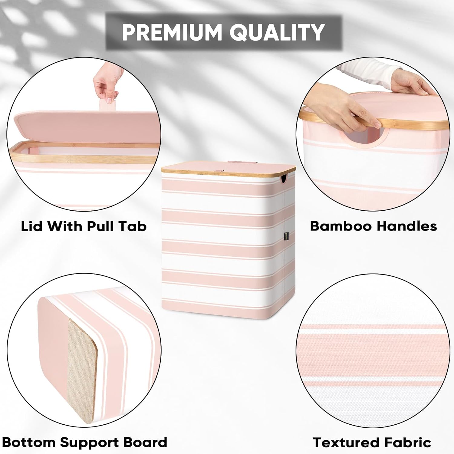 BALEINE Laundry Hamper with Lid, Tall Laundry Baskets with Bamboo Pull Handles, Large Laundry Bin with Internal Support (36 Gal/140L, Pink Stripe)