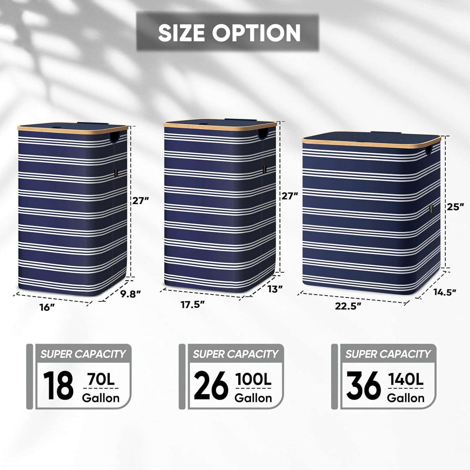 BALEINE Laundry Hamper with Lid, Tall Laundry Baskets with Bamboo Pull Handles, Large Laundry Bin with Internal Support (36 Gal/140L, Blue Pinstripe)