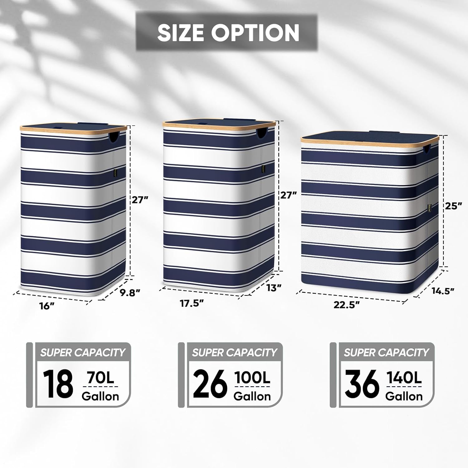 BALEINE Laundry Hamper with Lid, Tall Laundry Baskets with Bamboo Pull Handles, Large Laundry Bin with Internal Support (18 Gal/70L, Blue Stripe)