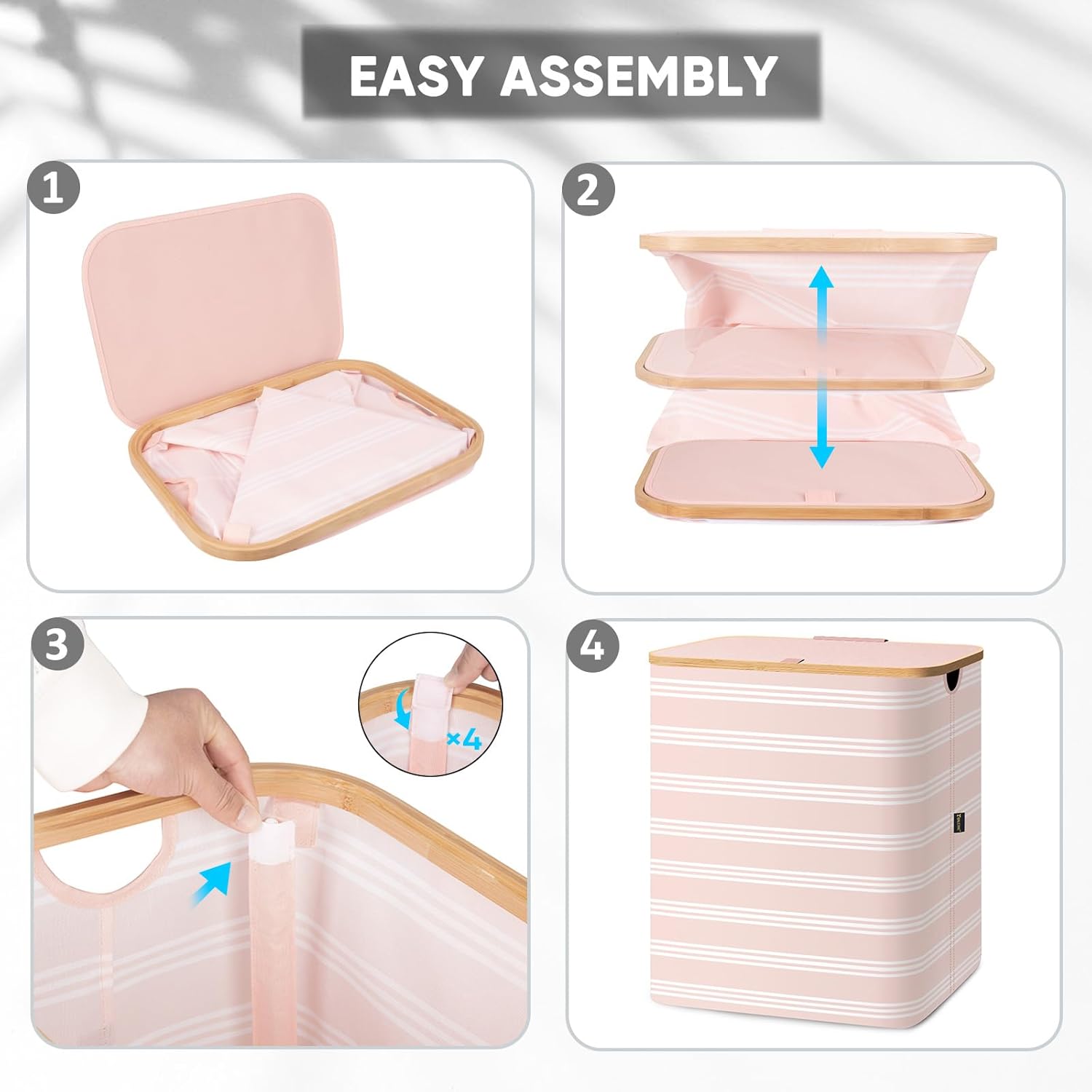 BALEINE Laundry Hamper with Lid, Tall Laundry Baskets with Bamboo Pull Handles, Large Laundry Bin with Internal Support (36 Gal/140L, Pink Pinstripe)