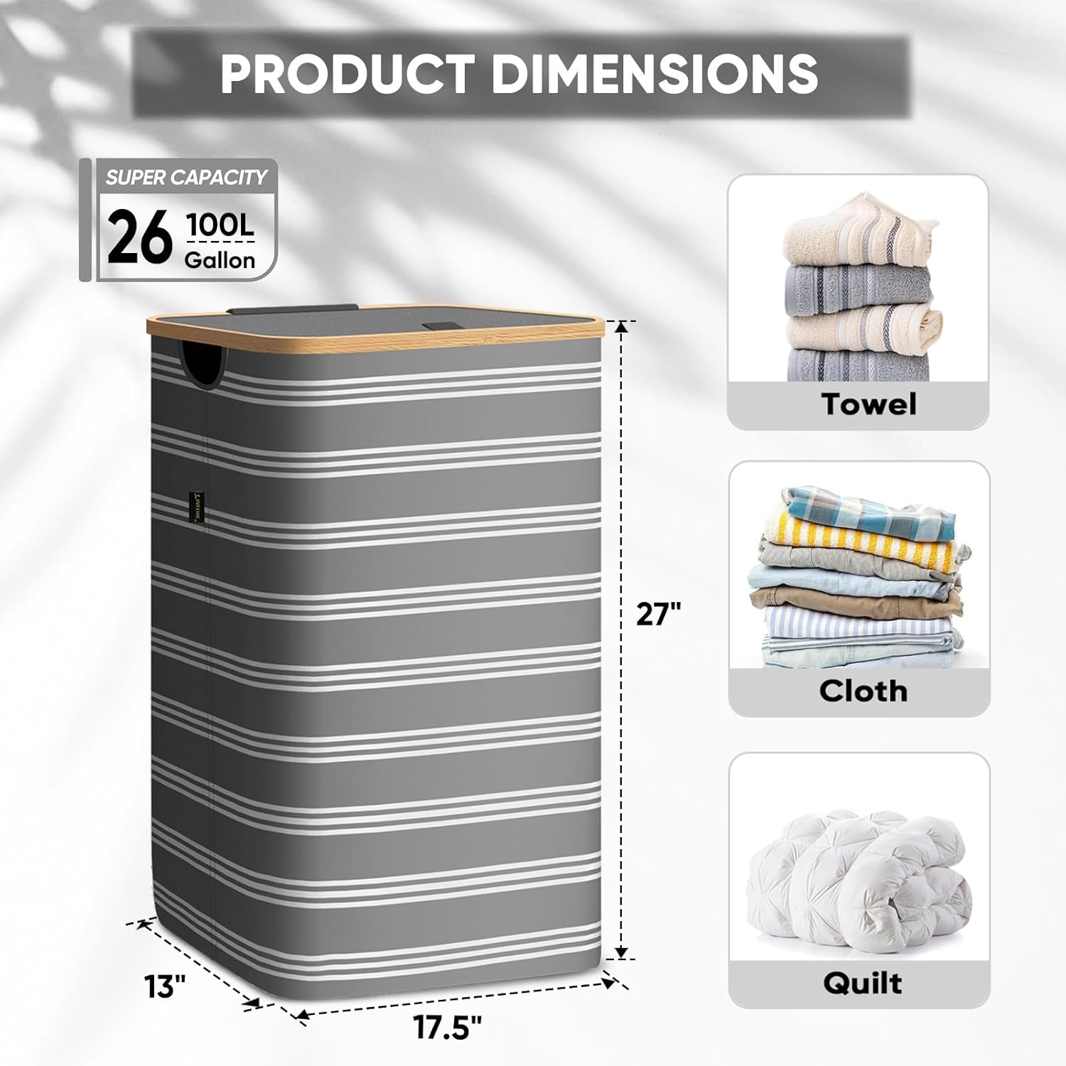 BALEINE Laundry Hamper with Lid, Tall Laundry Baskets with Bamboo Pull Handles, Large Laundry Bin with Internal Support (26 Gal/100L, Grey Pinstripe)