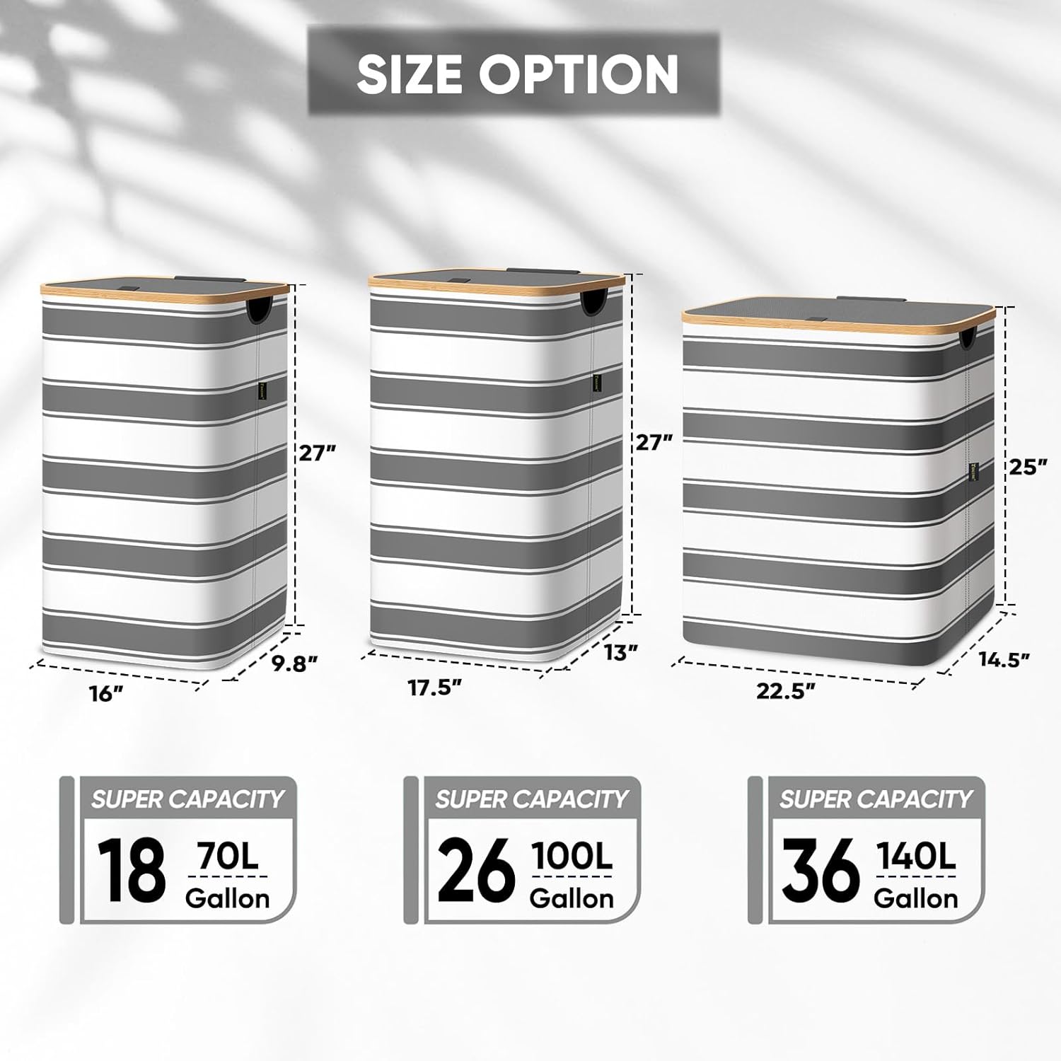 • [AMPLE CAPACITY AND EASY ACCESS] With 18 Gallon/26 Gallon/36 Gallon (70L/100 L/140 L) size option, the hampers for laundry provide ample capacity to hold all your dirty clothes, towels, bedding, and more. The lightweight lid is easy to open and close, providing quick and convenient access to your laundry.