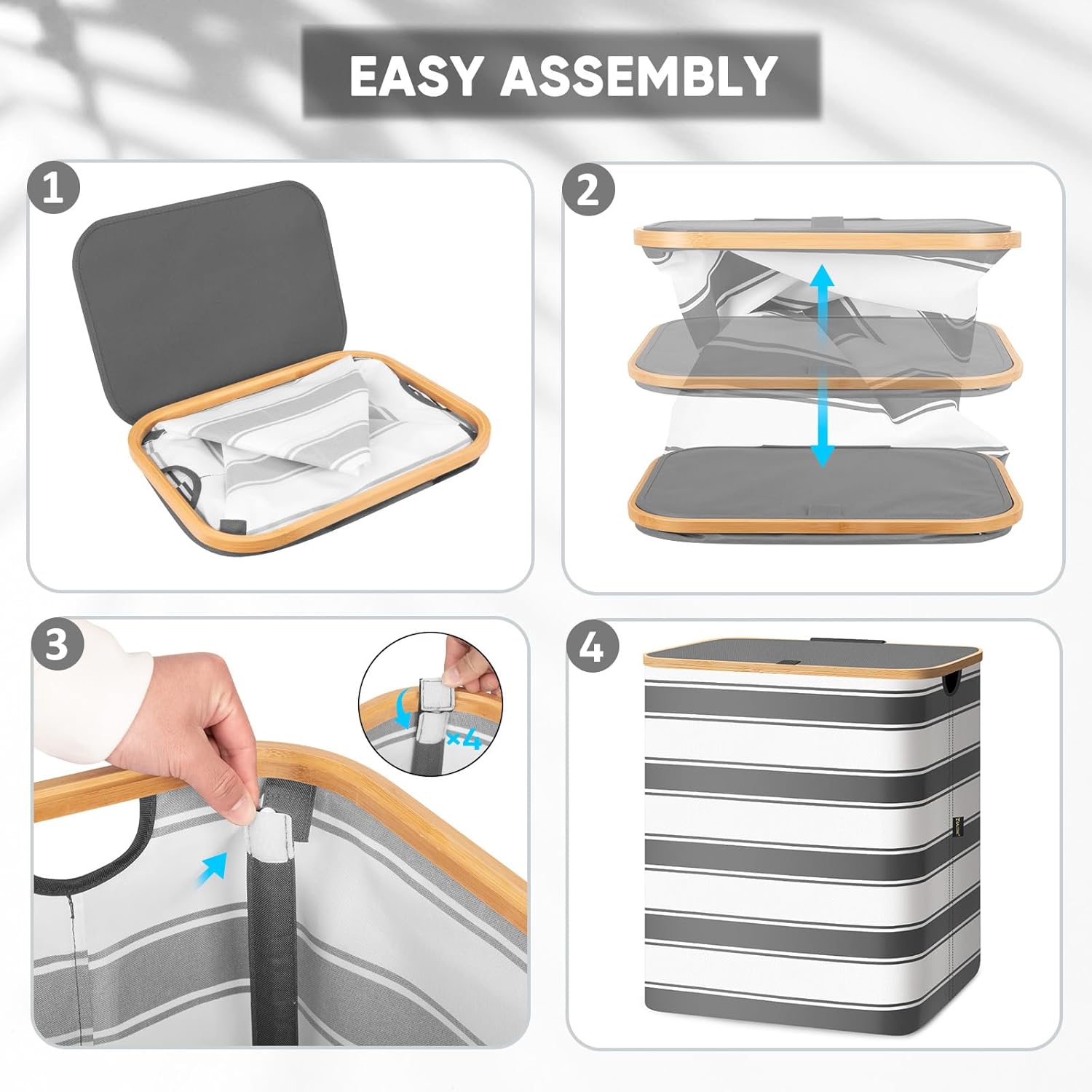 • [SLEEK DESIGN AND PREMIUM MATERIALS] Our laundry basket with lid adds a touch of elegance to any room. The natural bamboo rim gives it a timeless appeal, while the sturdy internal support structure ensures it maintains its shape, even when empty.