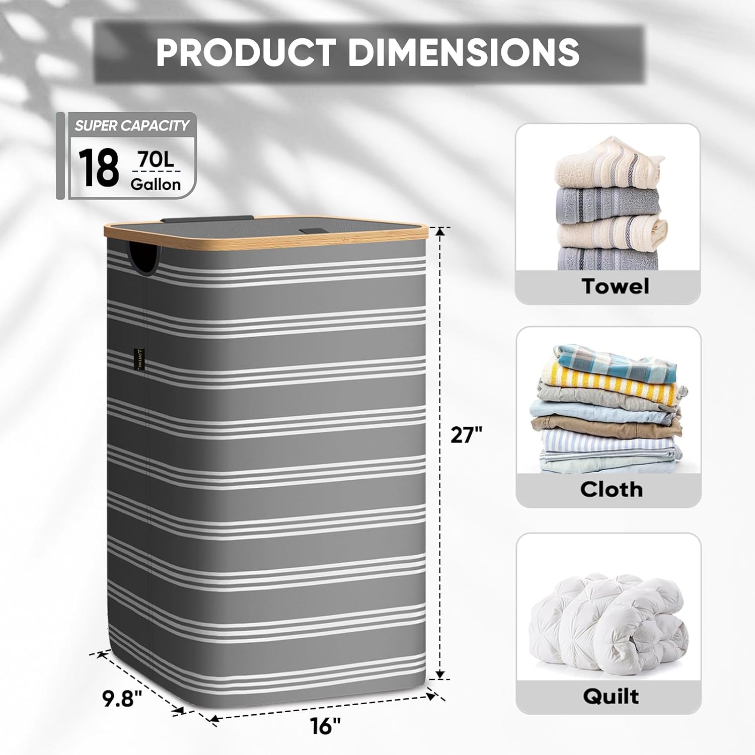 BALEINE Laundry Hamper with Lid, Tall Laundry Baskets with Bamboo Pull Handles, Large Laundry Bin with Internal Support (18 Gal/70L, Grey Pinstripe)