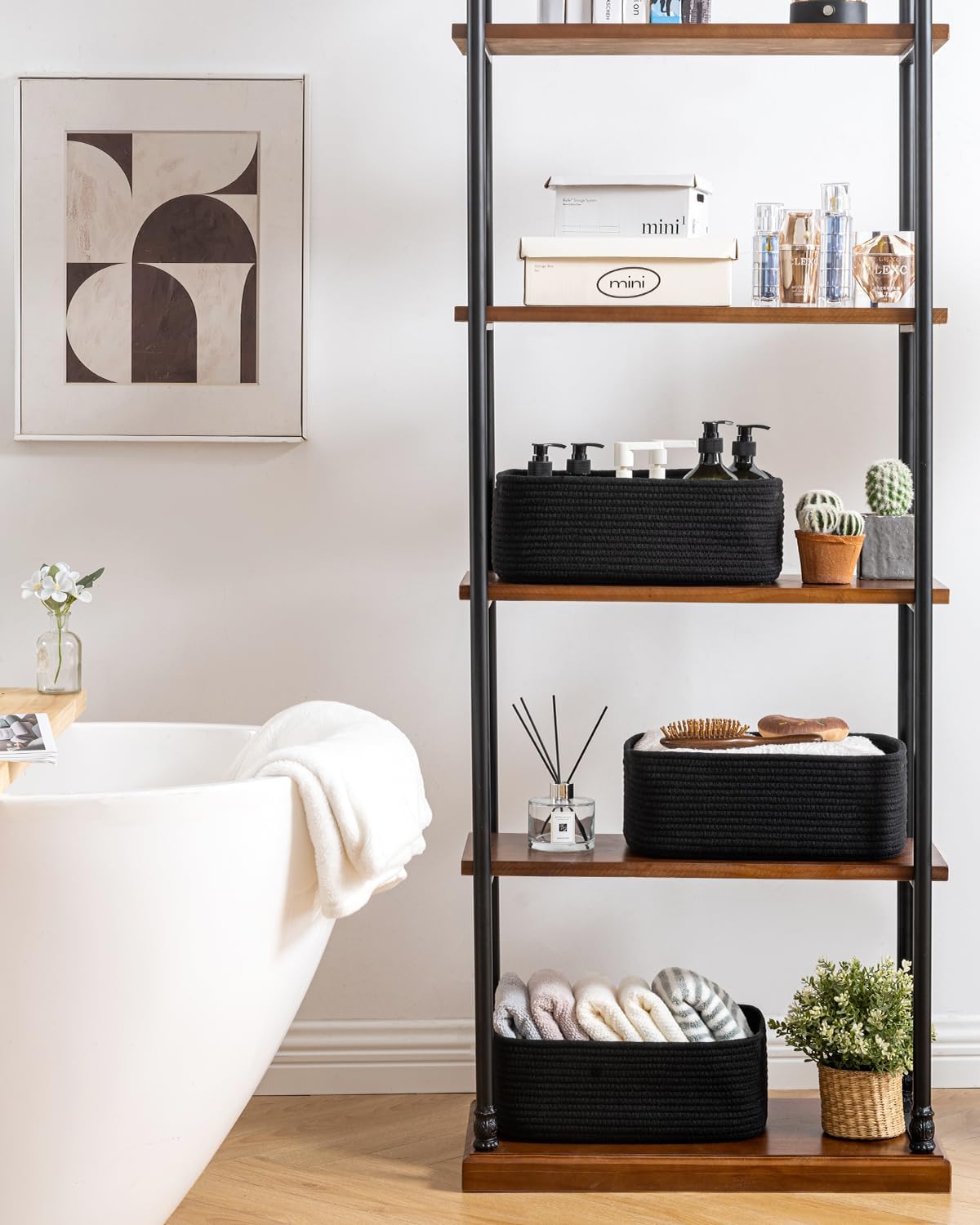 - [ Elegantly Designed to Match Any Décor ] Our small rope basket creates a minimalist appearance, and it adds a touch of warmth and texture to any room. The classic solid color design ensures seamless integration with your existing aesthetics, complementing any decoration. Perfect as decorative storage baskets for shelves, cabinets, and any open display space, making them a stylish and practical addition to any decor, enhancing the overall aesthetics of your room