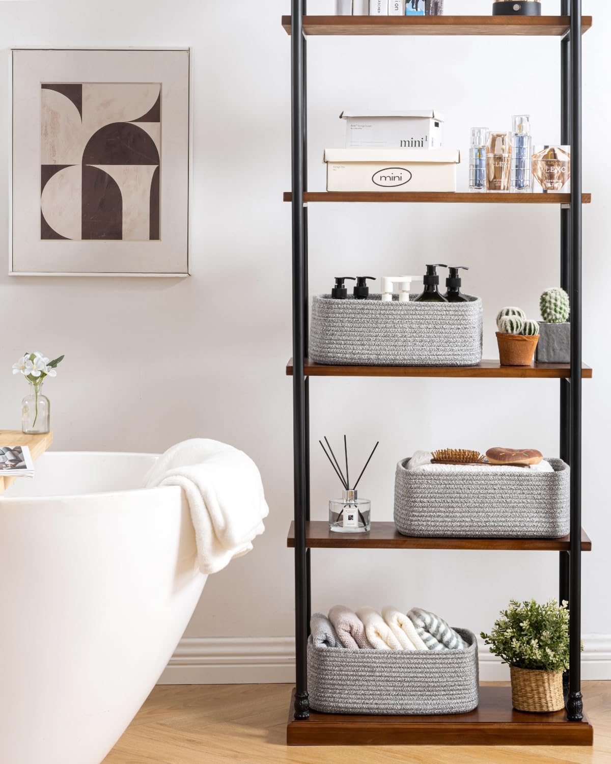 - [ Elegantly Designed to Match Any Décor ] Our small rope basket creates a minimalist appearance, and it adds a touch of warmth and texture to any room. The classic solid color design ensures seamless integration with your existing aesthetics, complementing any decoration. Perfect as decorative storage baskets for shelves, cabinets, and any open display space, making them a stylish and practical addition to any decor, enhancing the overall aesthetics of your room