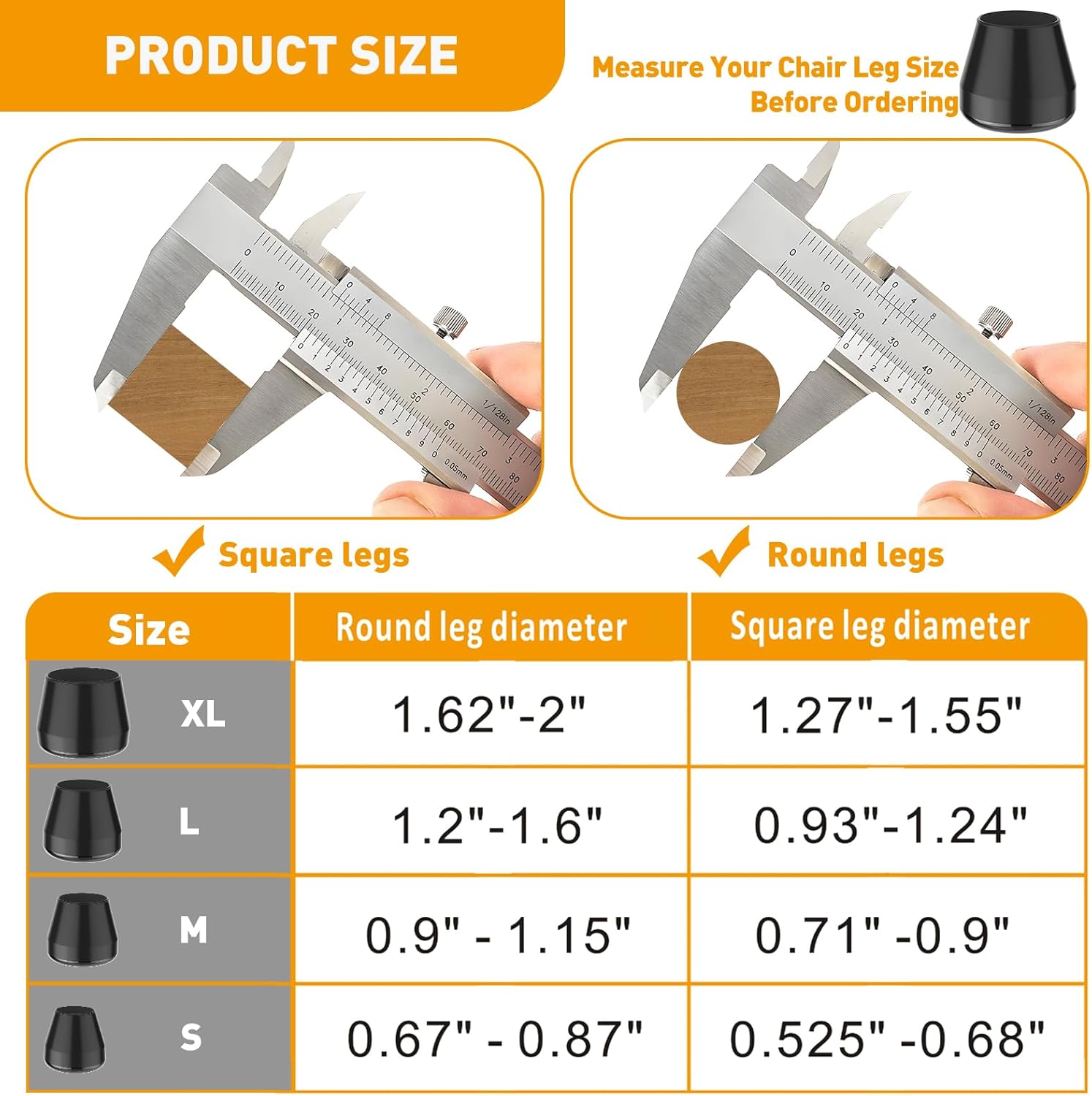 • 【UNIVERSAL SHAPE AND SIZE】:Furniture Sliders has High elasticity, free to pull.No deformation and no discolorratio.Chair Leg Sliders are good for round furniture legs 0.67" - 0.87"(17-22mm) and square legs 0.525" -0.68"(13.35-17.27mm).with perimeter of 2.1 - 2.72" (53.38-69.08mm).