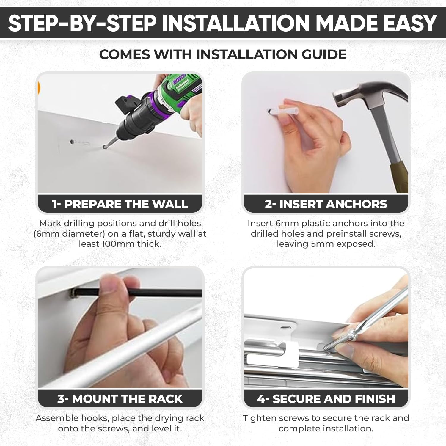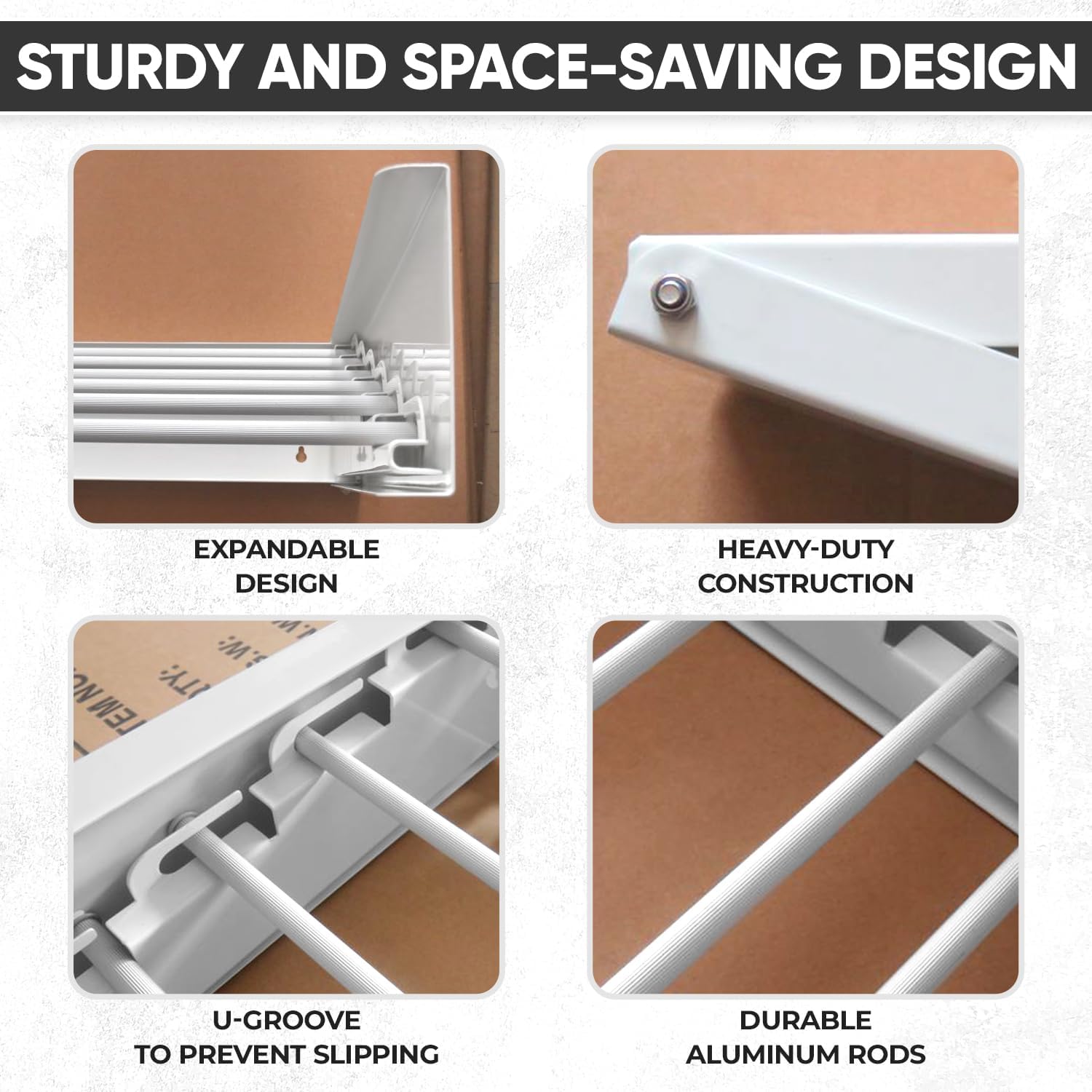 • Expandable & Retractable Design: Designed for flexibility, this wall-mounted drying rack easily expands when needed and retracts flat against the wall when not in use. Perfect for creating extra drying space on demand without permanent clutter