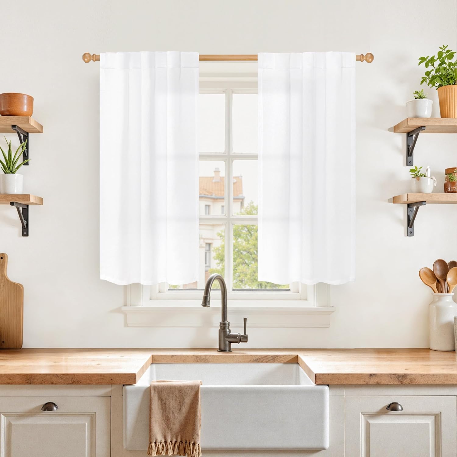 YoungsTex White Linen Curtains for Kitchen Window Over Sink - Small Half Window Drapes Semi Sheer with Back Tab for Front Door Cafe, 2 Panels, 30 X 40 Inch