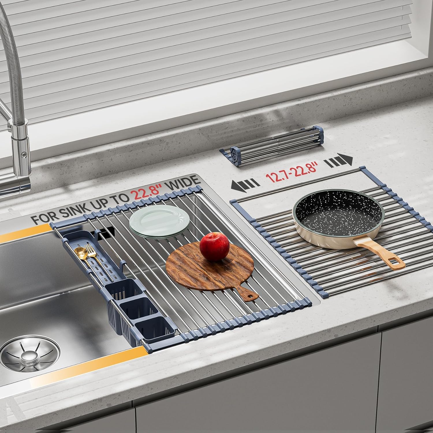 Expandable Over Sink Dish Drying Rack, Large Roll Up Dish Drying Rack with 2 Storage Baskets, Rolling Drain Mats for Kitchen Sink Counter, BPA-Free(12-22 * 15.3'', Blue)