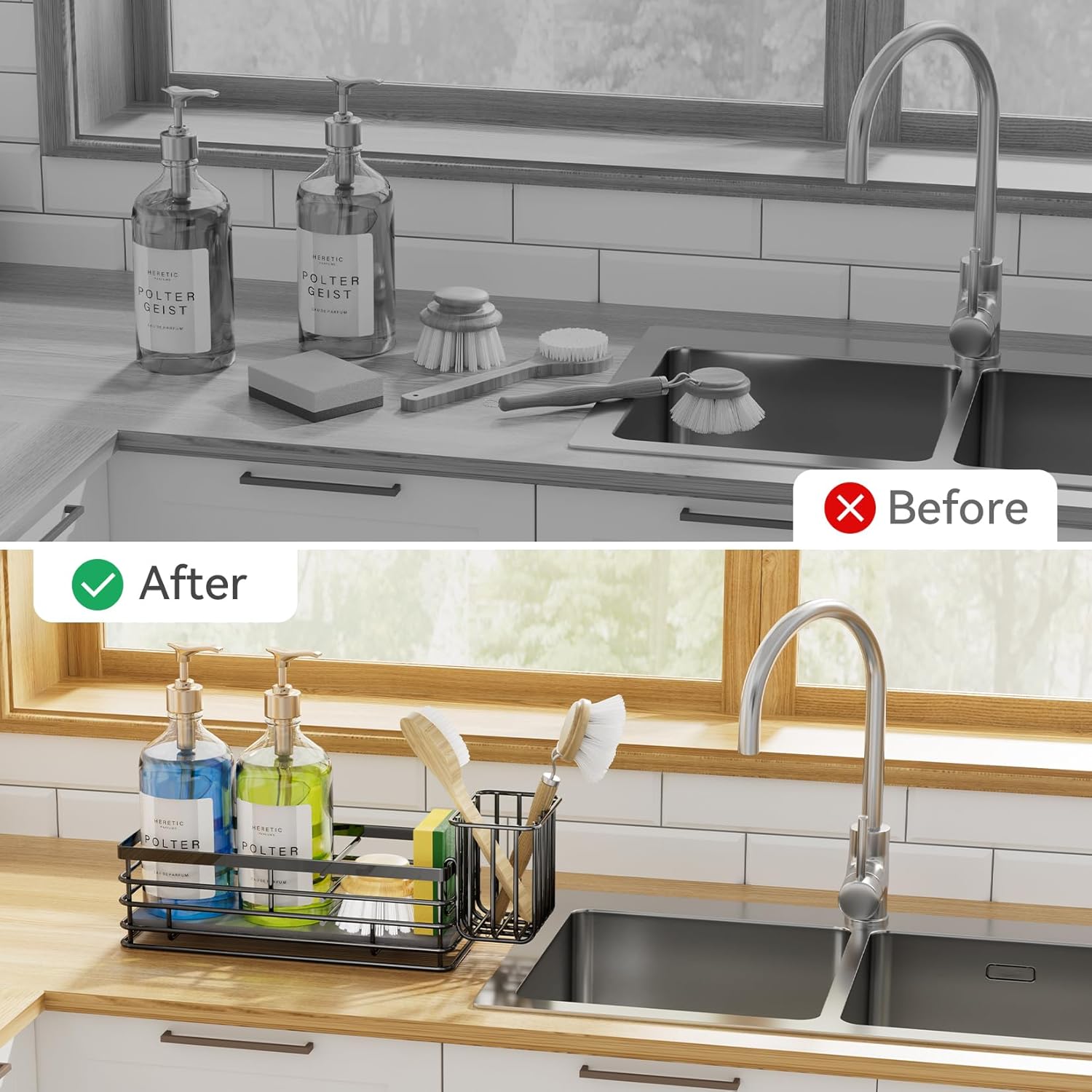 • 【Stability & Convenience Engineered】: The sink caddy sponge holder features a non-slip base that ensures stability during use, preventing sliding or tipping when wet