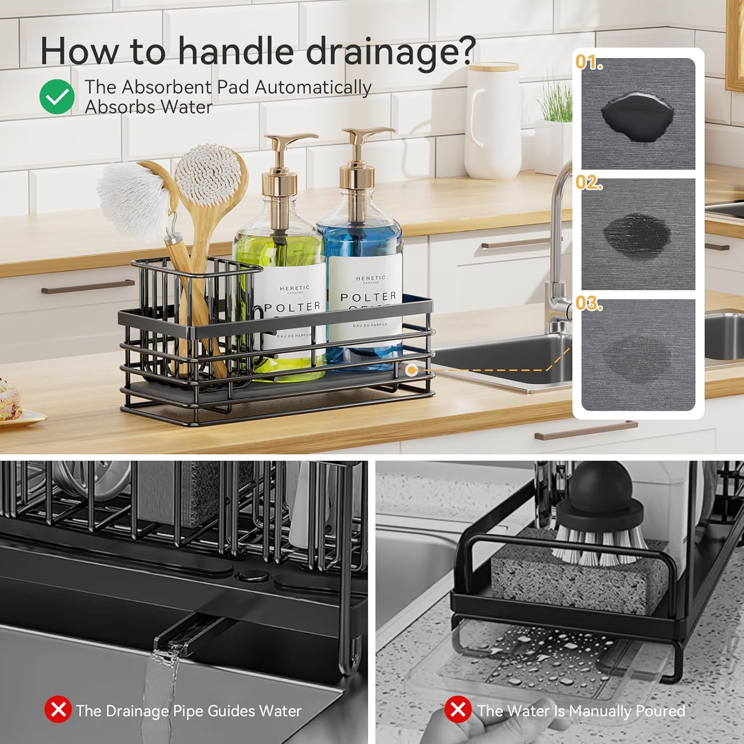• 【60 Second Quick Drying】: Our kitchen sink caddy features a diatomaceous earth absorbent pad that automatically absorbs water and dries in 60 seconds