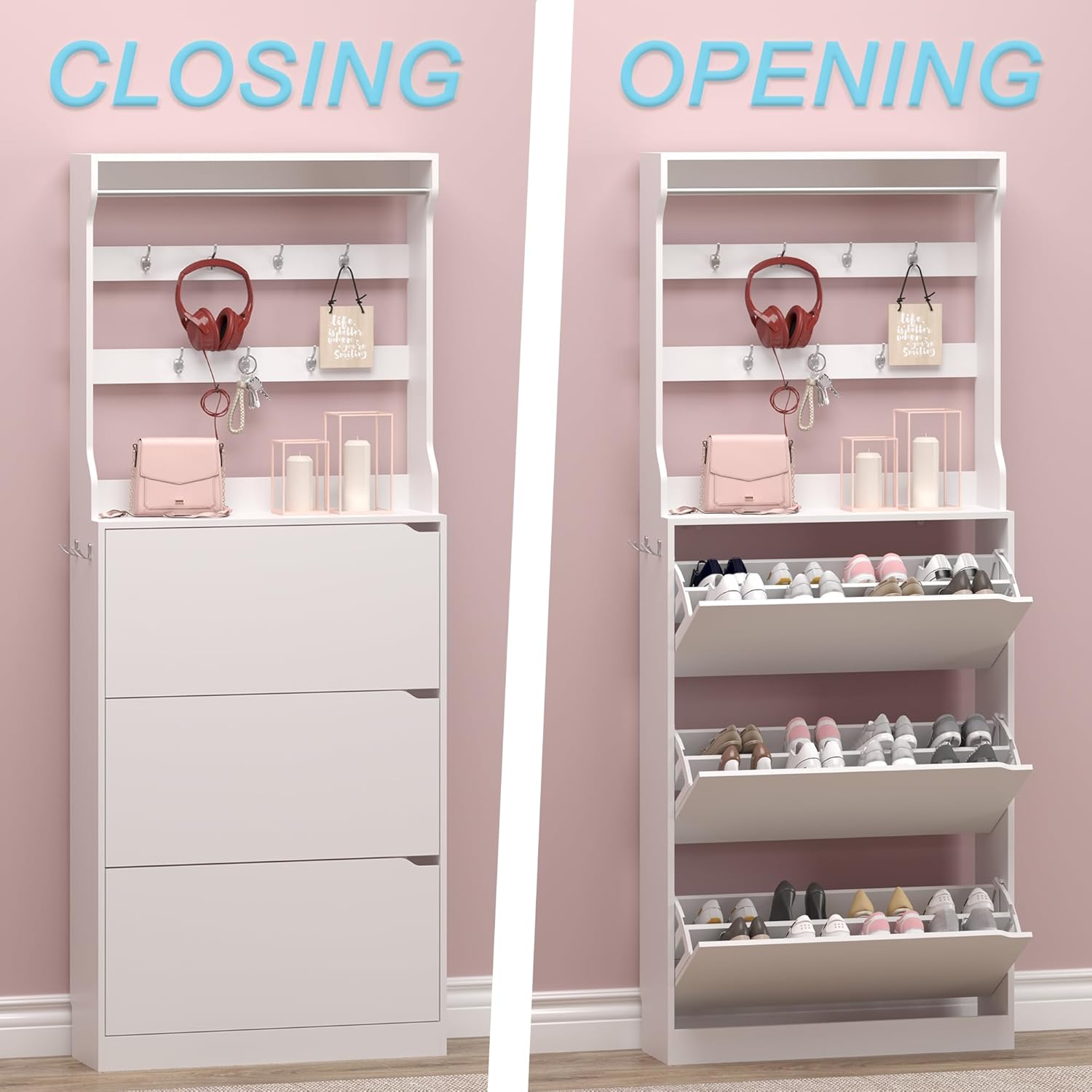 - 【Modern & Elegant Design】The clean and modern look of the hidden shoe cabinet, with an embedded handle design, makes it a great fit for any home style. The black or white finish enhances your entryway’s decor while keeping your space clutter-free and organized.