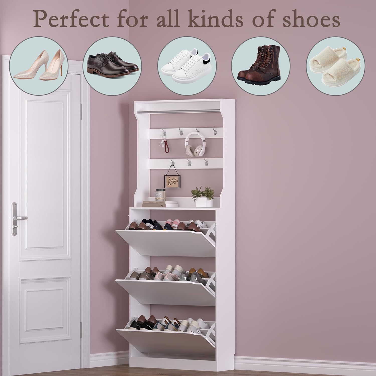 - 【Adjustable & Large Capacity Storage】: BORNOON shoe cabinet measures 9.45"D x 31.5"W x 78.74"H. Each of the 3 flip-out drawers contains an adjustable or removable middle panel, allowing you to customize the space to fit boots, sneakers, heels, and flats. The added coat rack provides hooks and a hanging bar for coats, scarves, and bags.