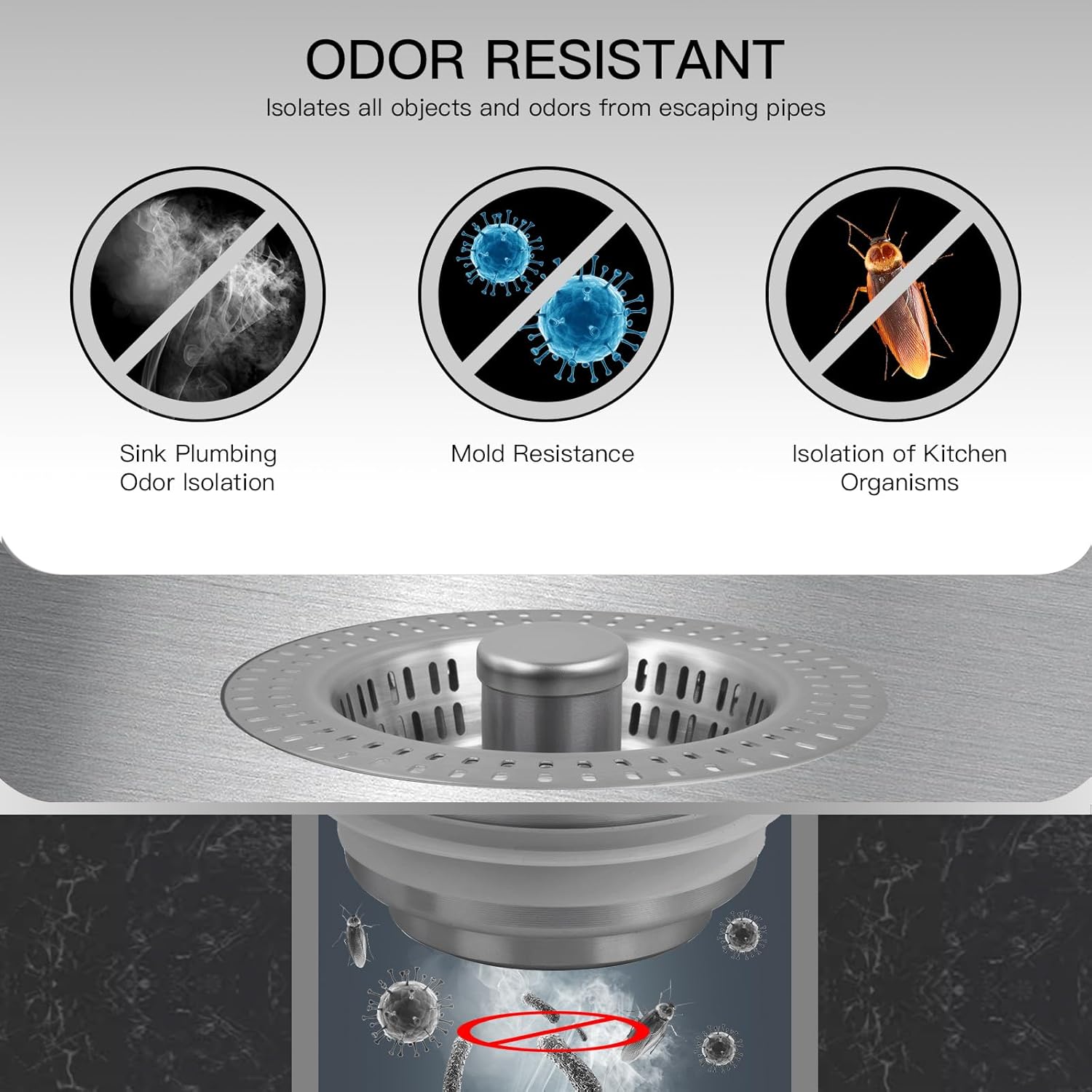 • 3-in-1 Kitchen Sink Strainer and Stopper: One item, three Functions. The kitchen sink plug combo has the functions of storing and draining water, filtering and keeping odors out. Sink stopper helps to save water while washing dishes, a sink filter basket to collect food scraps when draining, ⚠️Note: Suitable for deep sinks