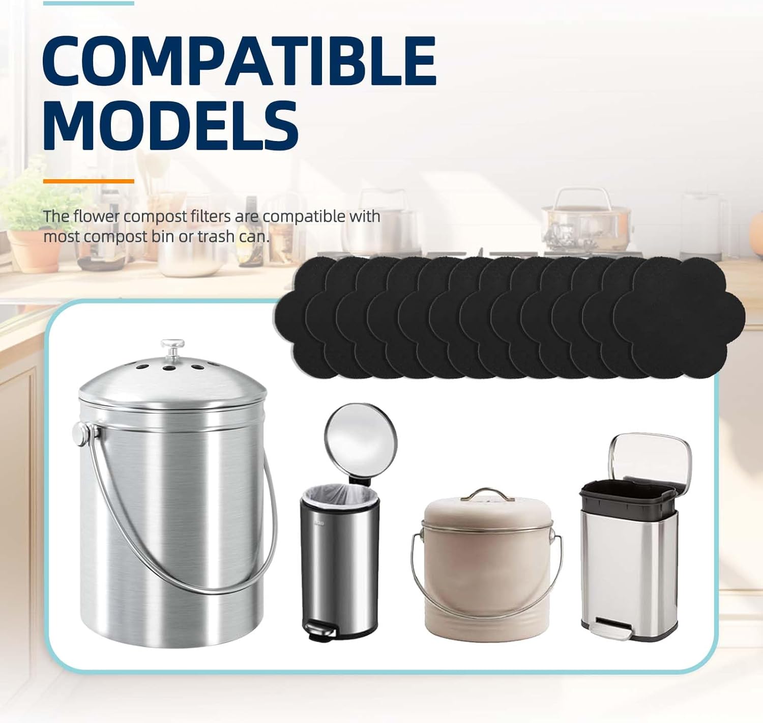 - [Easy to use and replacement] : Remove the old trash can deodorizer and fold the charcoal of the new compost box filter. You only need to remove the old garbage can odor eliminator on the trash can and stick a new compost bin charcoal filter. For different sizes of trash cans only need to cut the flower shaped charcoal filter to adapt to the size of the pail.