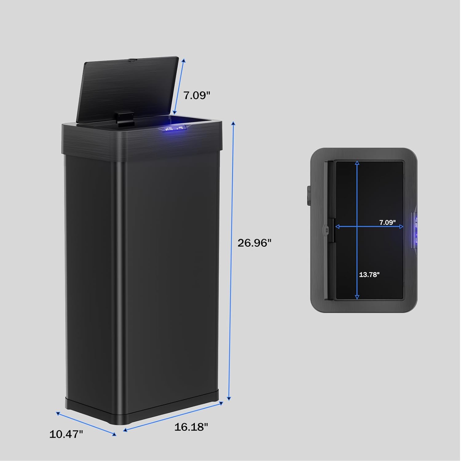 - 【Soft-Close Lid and Integrated Design】Sensor trash can lid has a slow-closing function, ensuring each closure is gentle and quiet, reducing noise and disturbance to nearby people while also enhancing the trash can's sealing ability. Trash can opening measures 13.78 × 7.09 inches, making it easy to deliver even large items