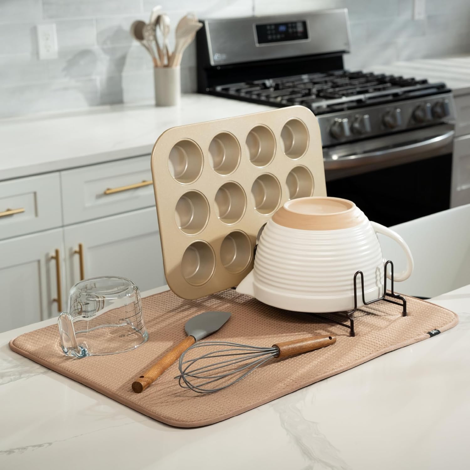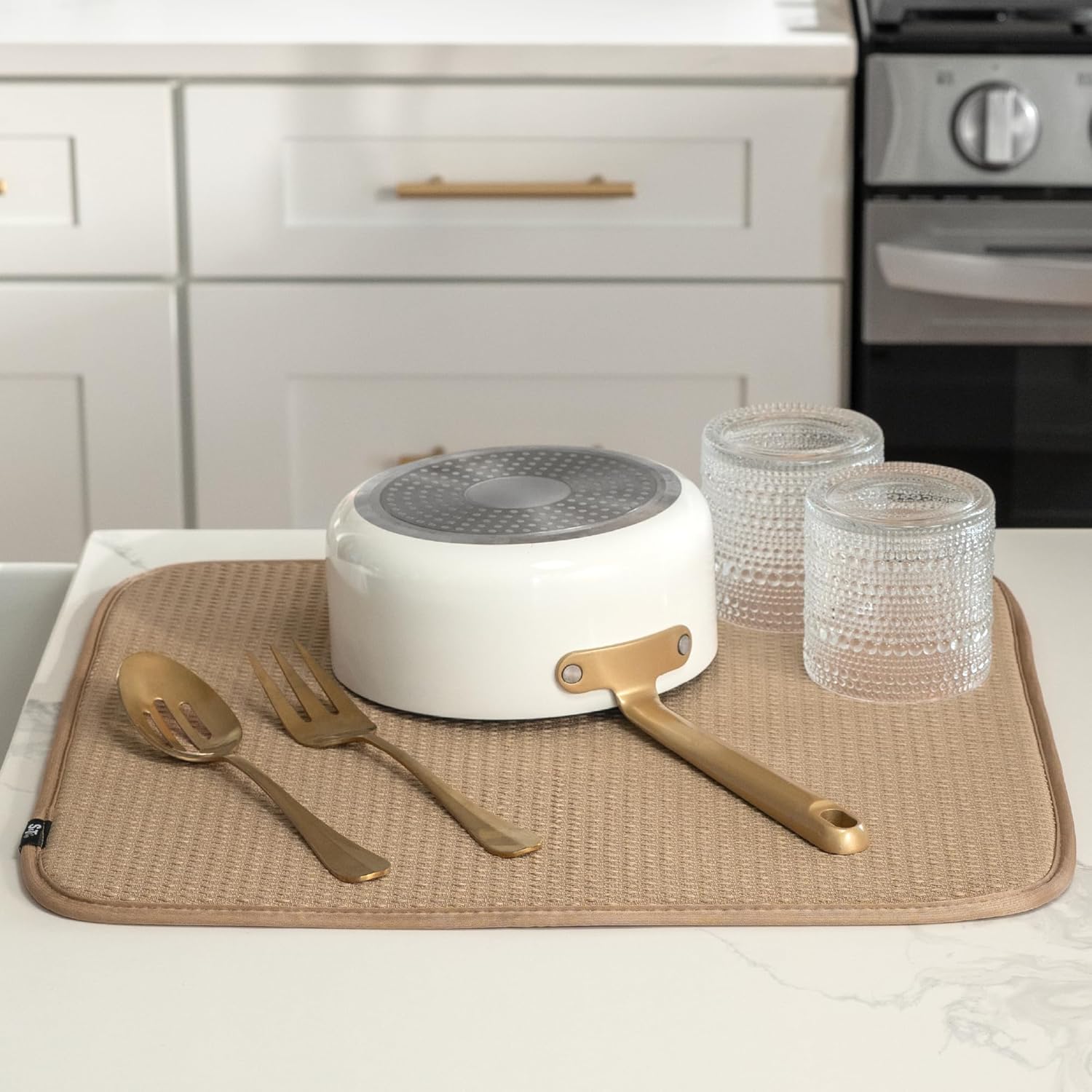 S&T INC. Dish Drying Mat XL, 18” x 24”, Absorbent Microfiber Kitchen Counter Mat, Drying Pad for Dishes, Utensils, Pots and Pans, Extra Large, Diamond Texture, Almond