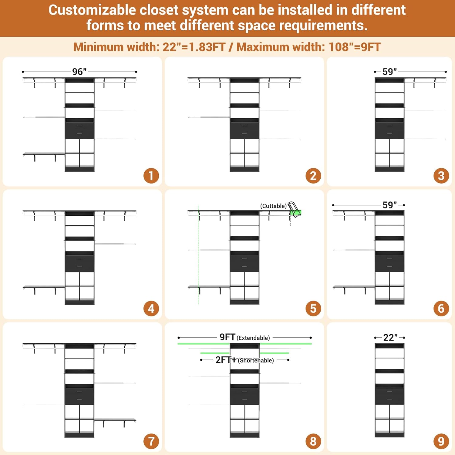 Closet System - 4.75-8FT Closet Organizer System with Wooden Drawers & Cube Storage Organizer, Up To 96" Closet Systems for Nursery & Walk-In Closets with Cuttable Hanging Shelving, Black