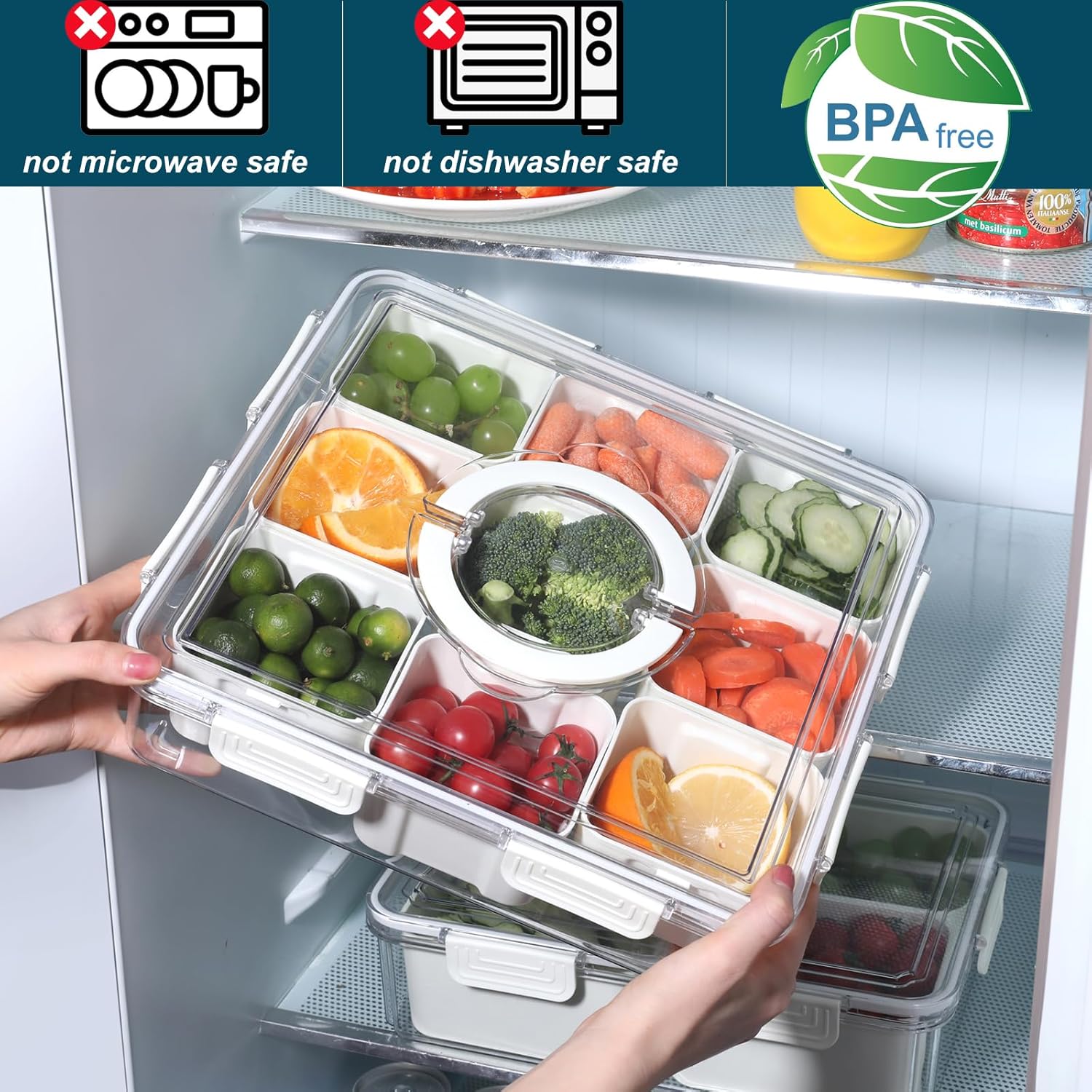 Taiuloo Divided Serving Tray with Lid & Handle, Airtight 9 Compartment Snackle Box Charcuterie Container, Fridge Organizer Bins, Food Storage Container Veggie Tray for Snack, Fruit, Candy, Nuts