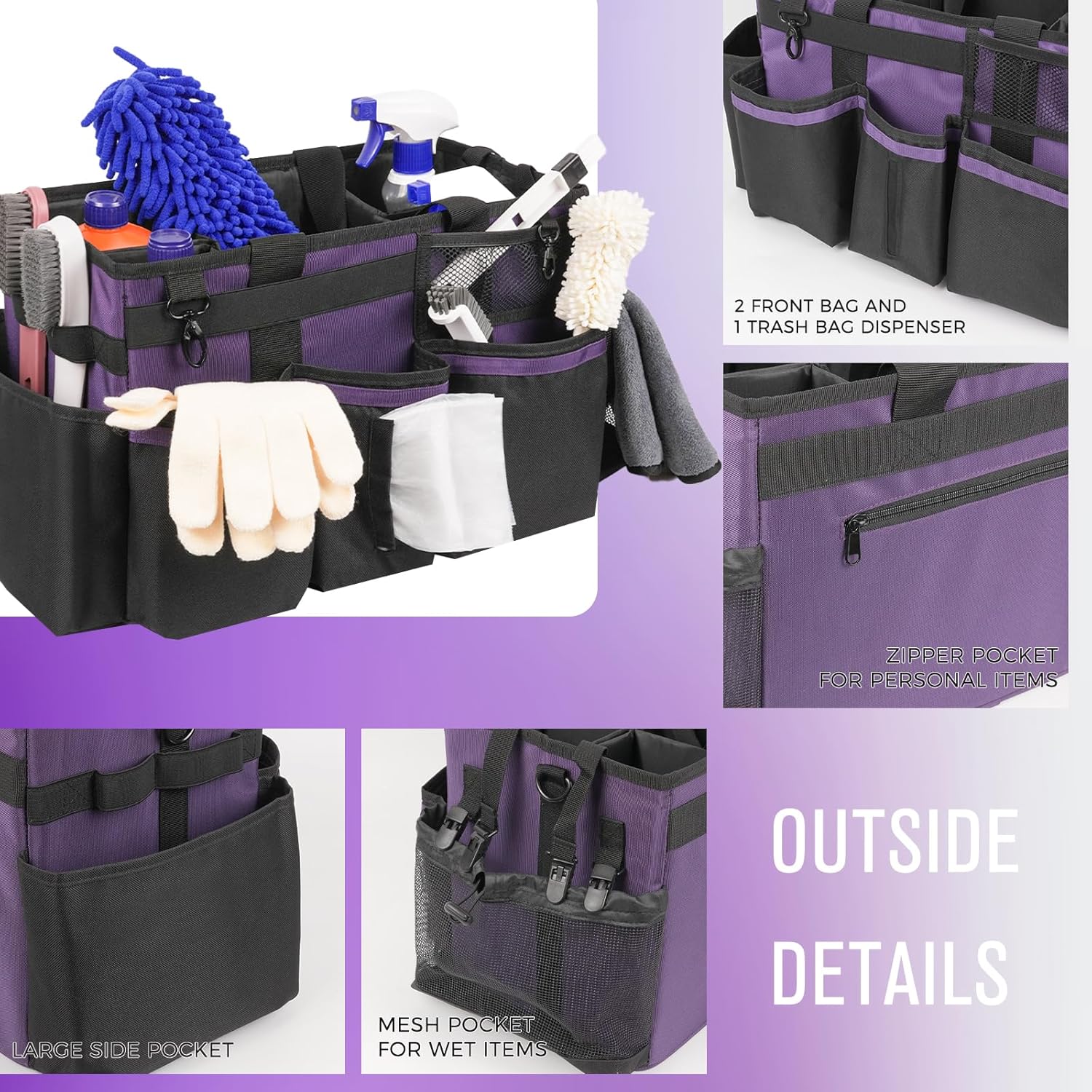 - Exquisite Details: The 5 inner compartments are large enough for organizing cleaning tools. 3 individual deep outer pockets, 1 mesh side pocket and 1 trash bag dispenser allow you storage and access of other cleaning tools. Also, securely zipped pocket is design for safely storing your important items