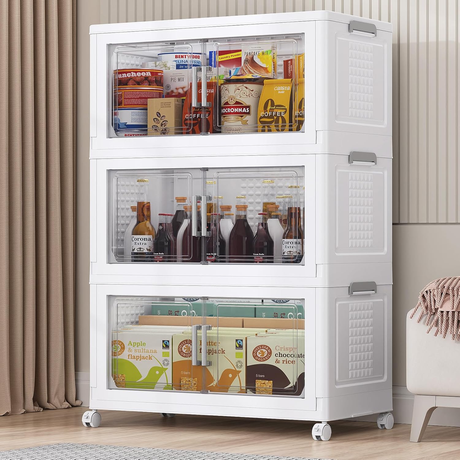 - 【Large Storage Bins With Doors】BROVIEW storage bins offer an astonishing capacity of 108Qt/27Gal per tier. 3Pack foldable storage bin, equipped with doors and wheels, expands to generous dimensions of 26.7"L x 14.7"W x 42"H and is made of Polypropylene plastic material which is sturdy, visual, and odorless, each layer can hold up to 110lbs. (Note: Each set includes ONLY ONE LID!)