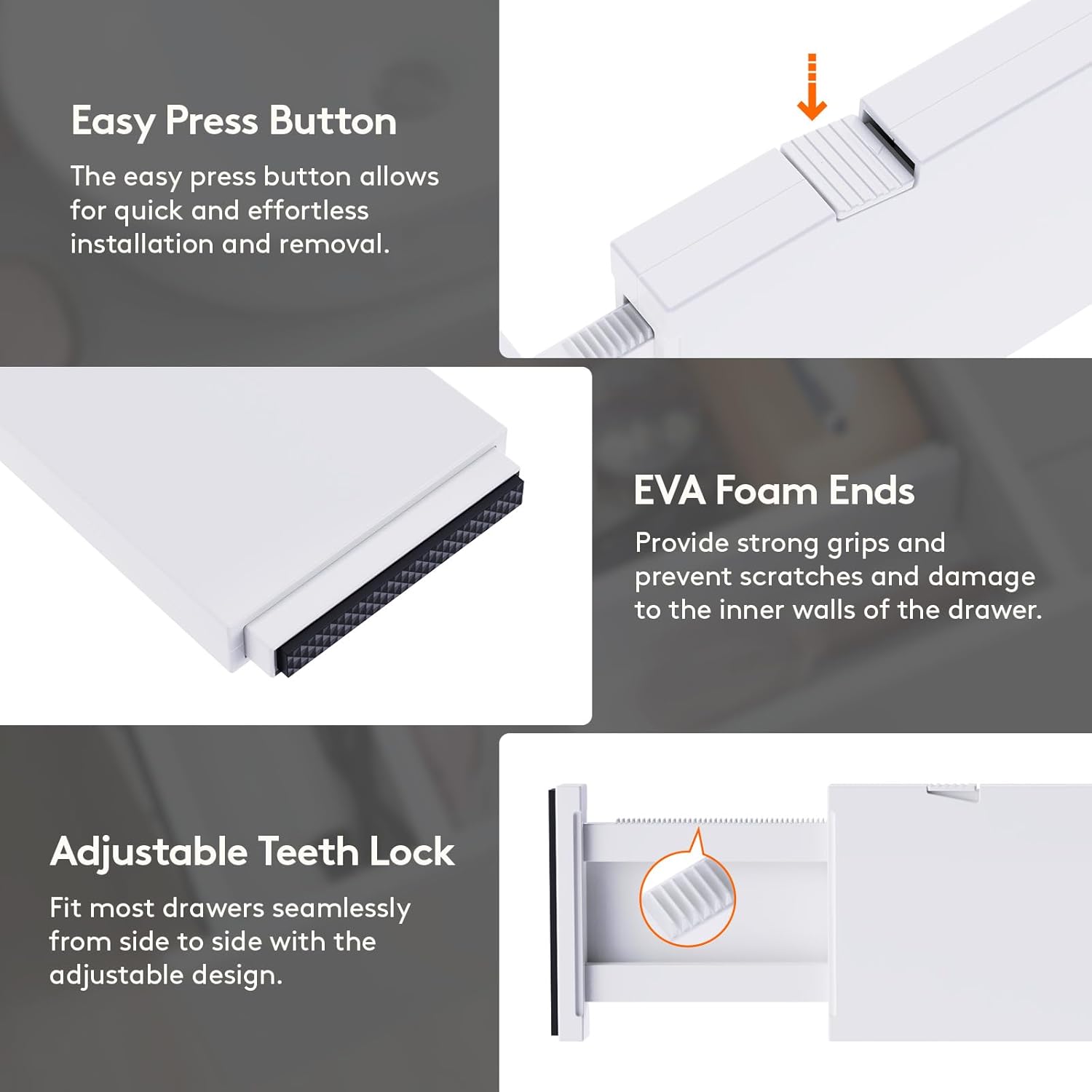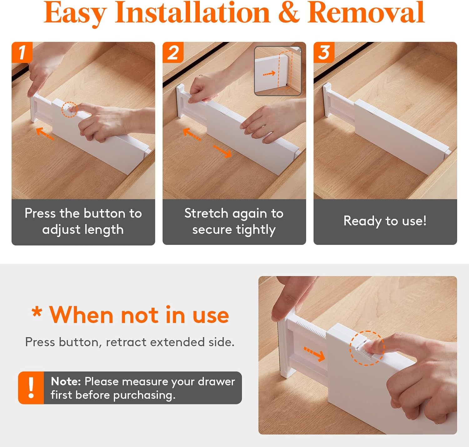 • Easy to Install: Press the top button and stretch to the desired length, then fully extend again to secure in place; The strong spring tension keeps each drawer organizer securely upright; To retract, press the top button and push the stretched side