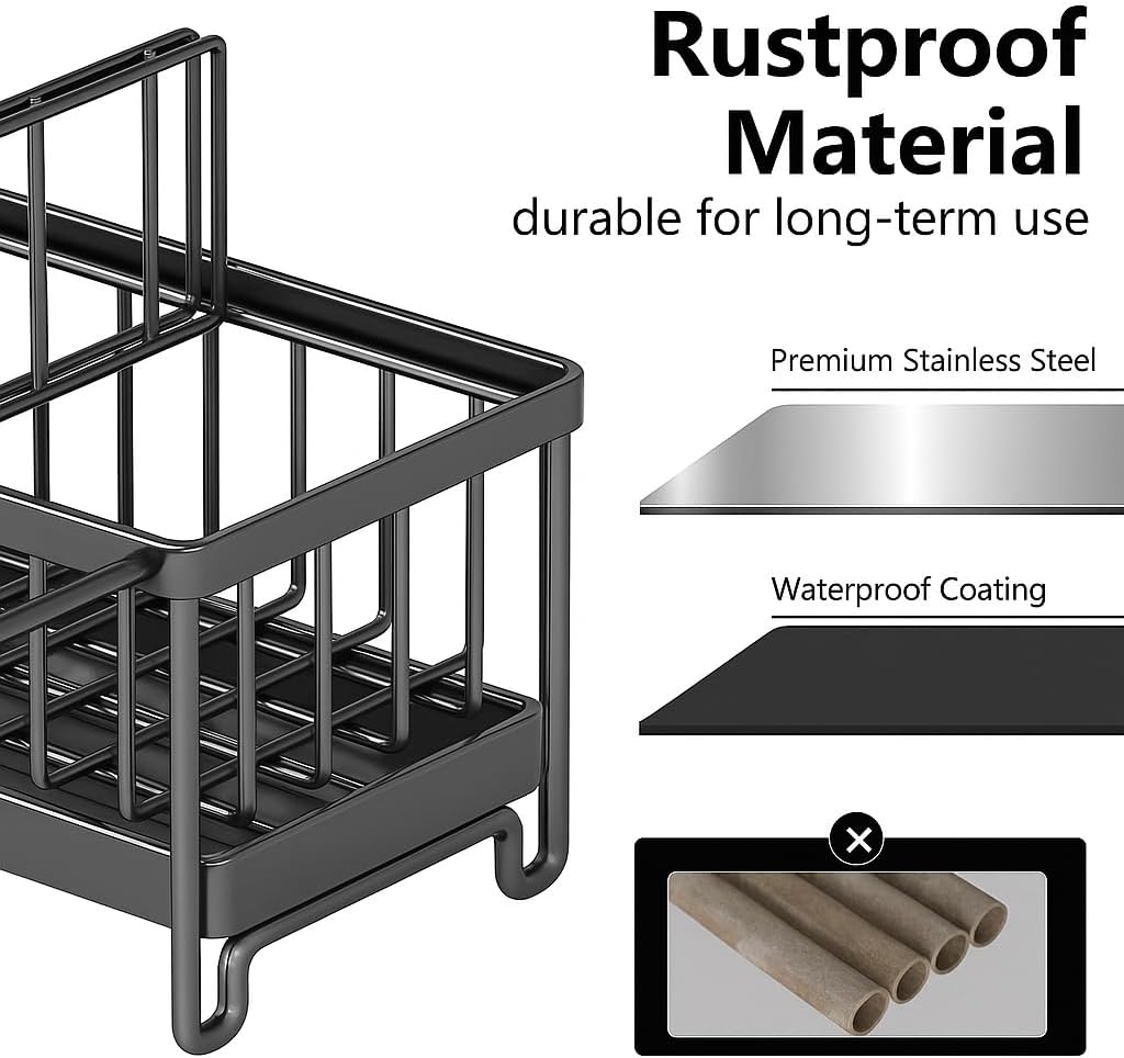 • DURABLE & RUSTPROOF STAINLESS STEEL – Built from premium stainless steel, this sponge caddy for kitchen sinks resists rust and deformation. It’s long-lasting, sturdy, and easy to clean—just rinse under water. A great addition to your kitchen sink accessories and organization.