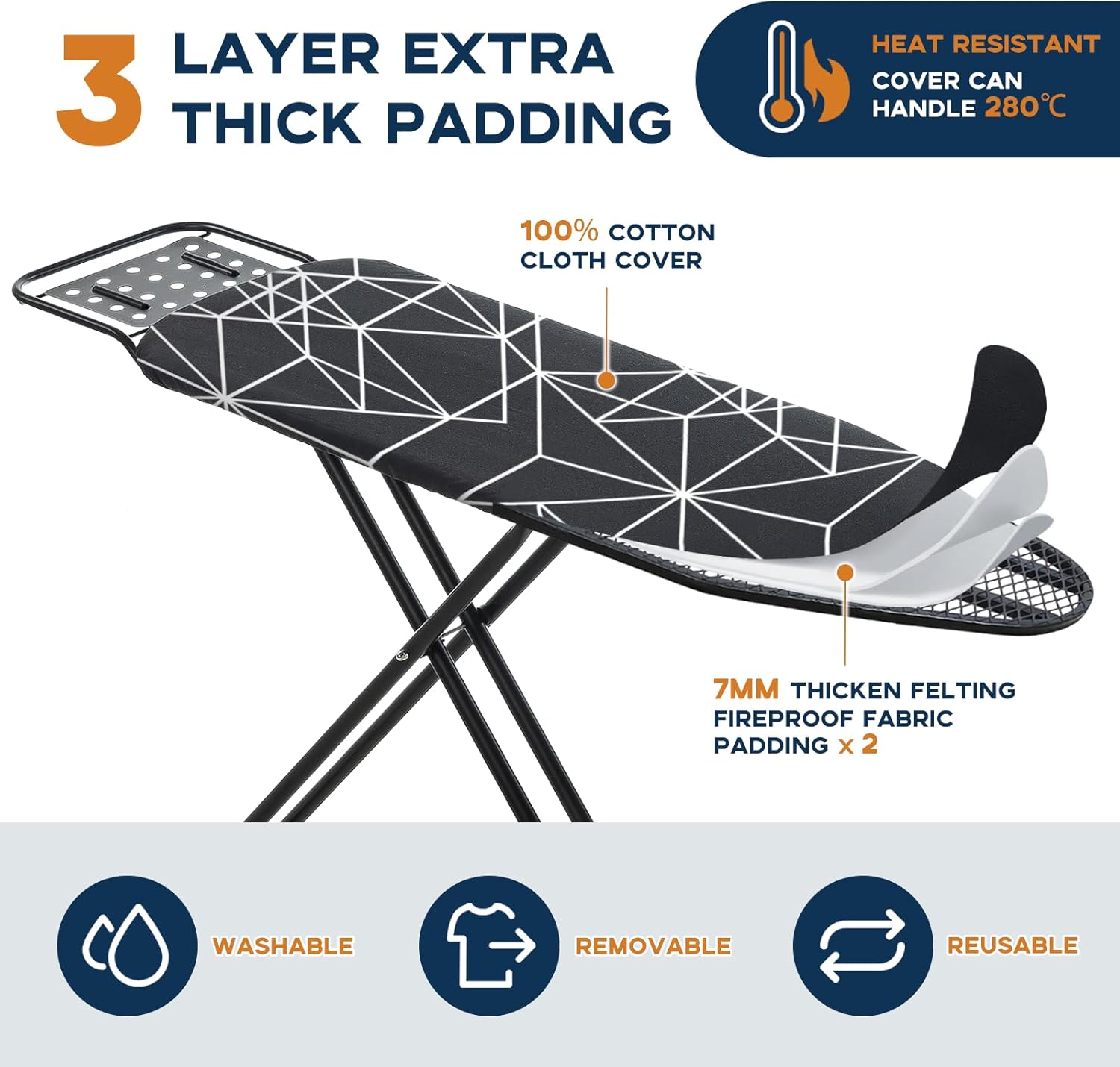 • Heat-resistant Cover: The ironing board cover is a 100% cotton cloth cover. It's removable, washable, and reusable, and it comes with two layers of 7mm thick pads made of fireproof fabric. The extra thick cloth cover ensures you an extraordinary ironing experience.