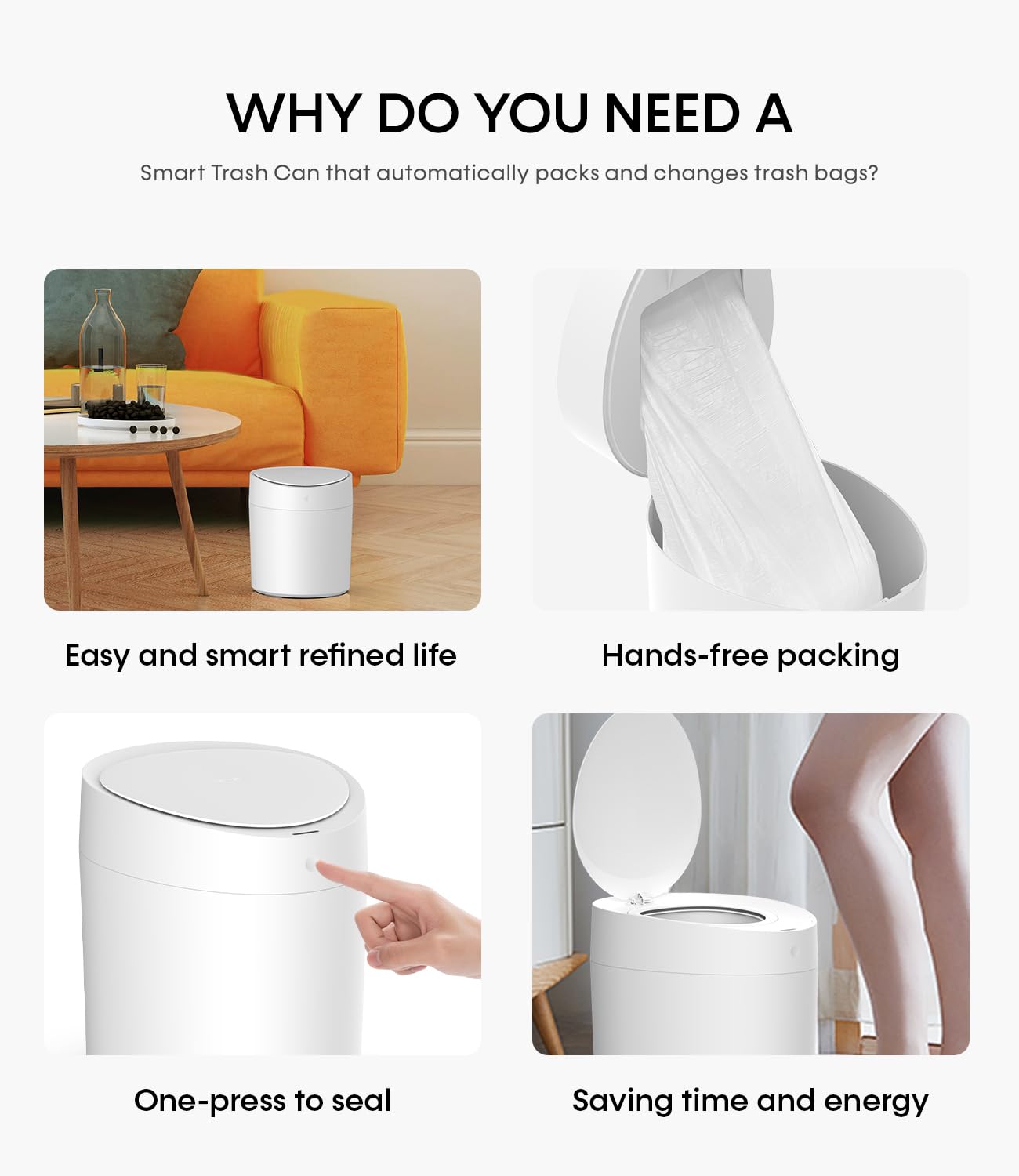 - Self-Sealing and Changing in One-Touch: Just press and hold the touch button of the automatic trash can for 3 seconds to achieve one-click automatic packaging. After packaging, press main lid button after hearing the beep sound. After the lid is automatically bounced, take out the trash bag and turn off the lid manually to automatically change a new trash bag.