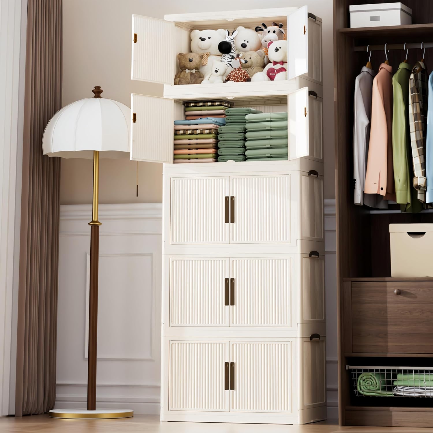 520QT/130GAL Stackable Storage Bins with 1 lid Storage Closet Organizers and Drawer Foldable Storage Bins Container with door Collapsible Storage Box for Home Office Dorm Room(104Qt X 5),White