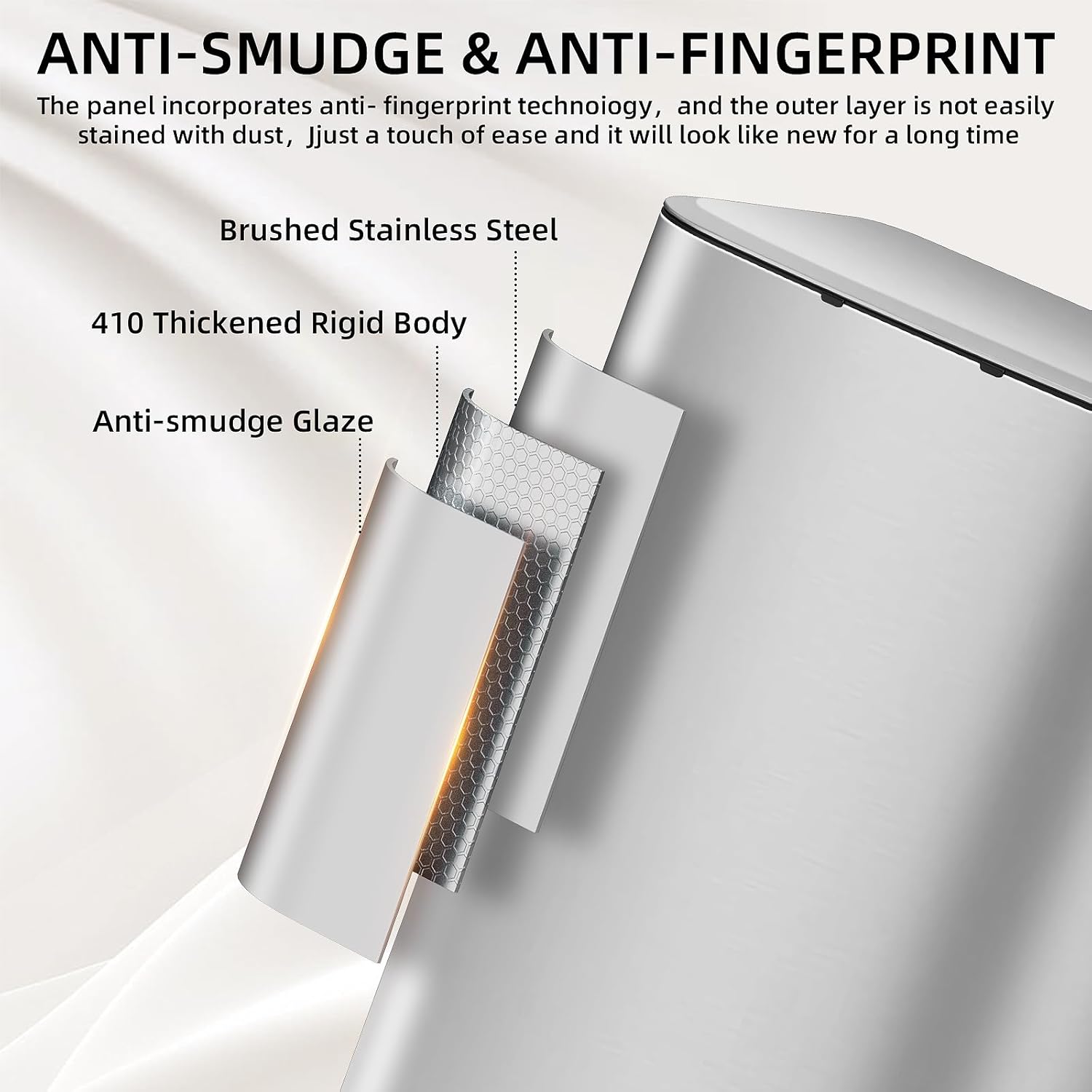 - Soft Close Lid: Unlike conventional garbage cans that can be quite noisy, our kitchen trash can use slow down technology, This is the quietest trash can you'll ever use—no annoying noises! Placing this stainless steel trash can in the corner of your bedroom is a great choice.