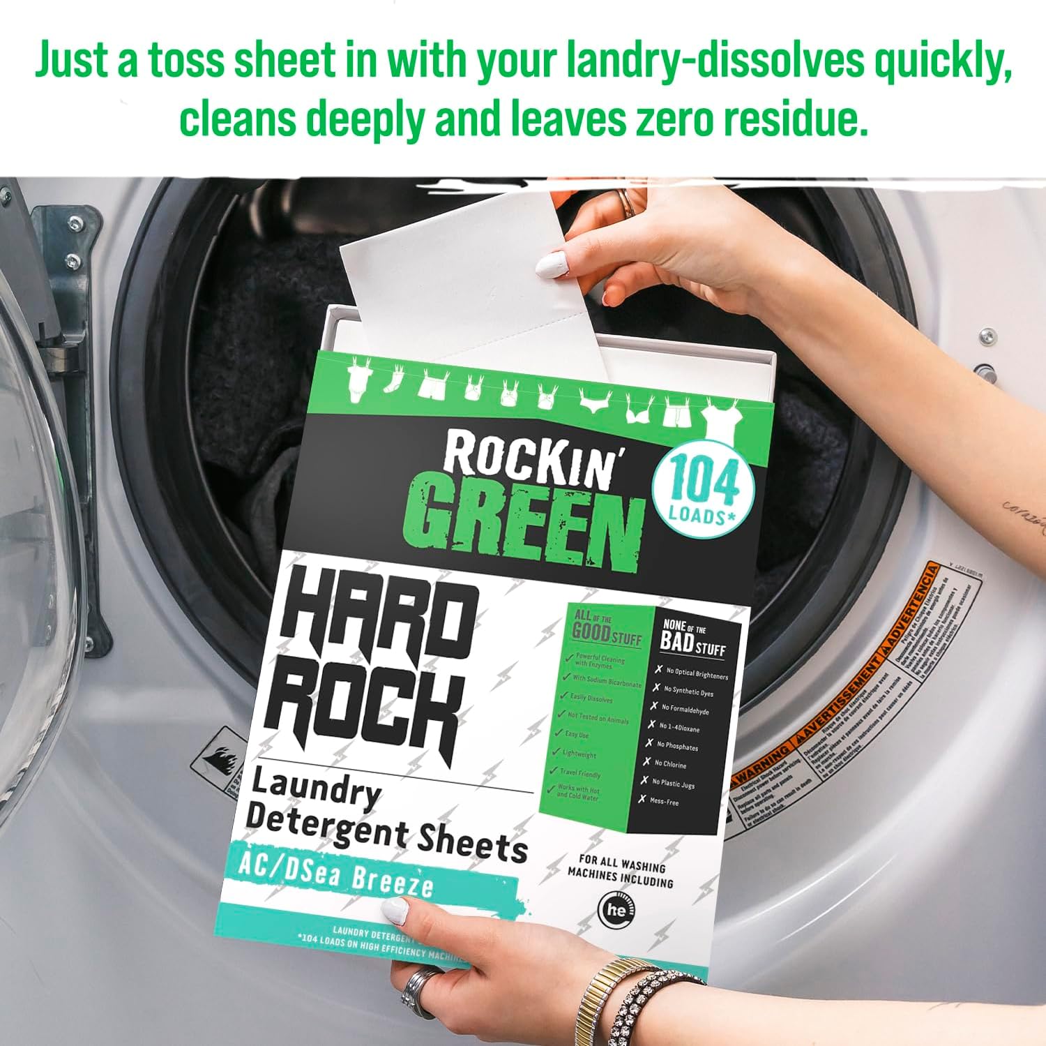 Rockin' Green Hard Rock Travel Laundry Detergent Sheets for Hard Water - Mess-Free Laundry Sheet Detergent with Sodium Bicarbonate - Easily Dissolvable Laundry Soap Sheets (104 Loads, AC/DSea Breeze)