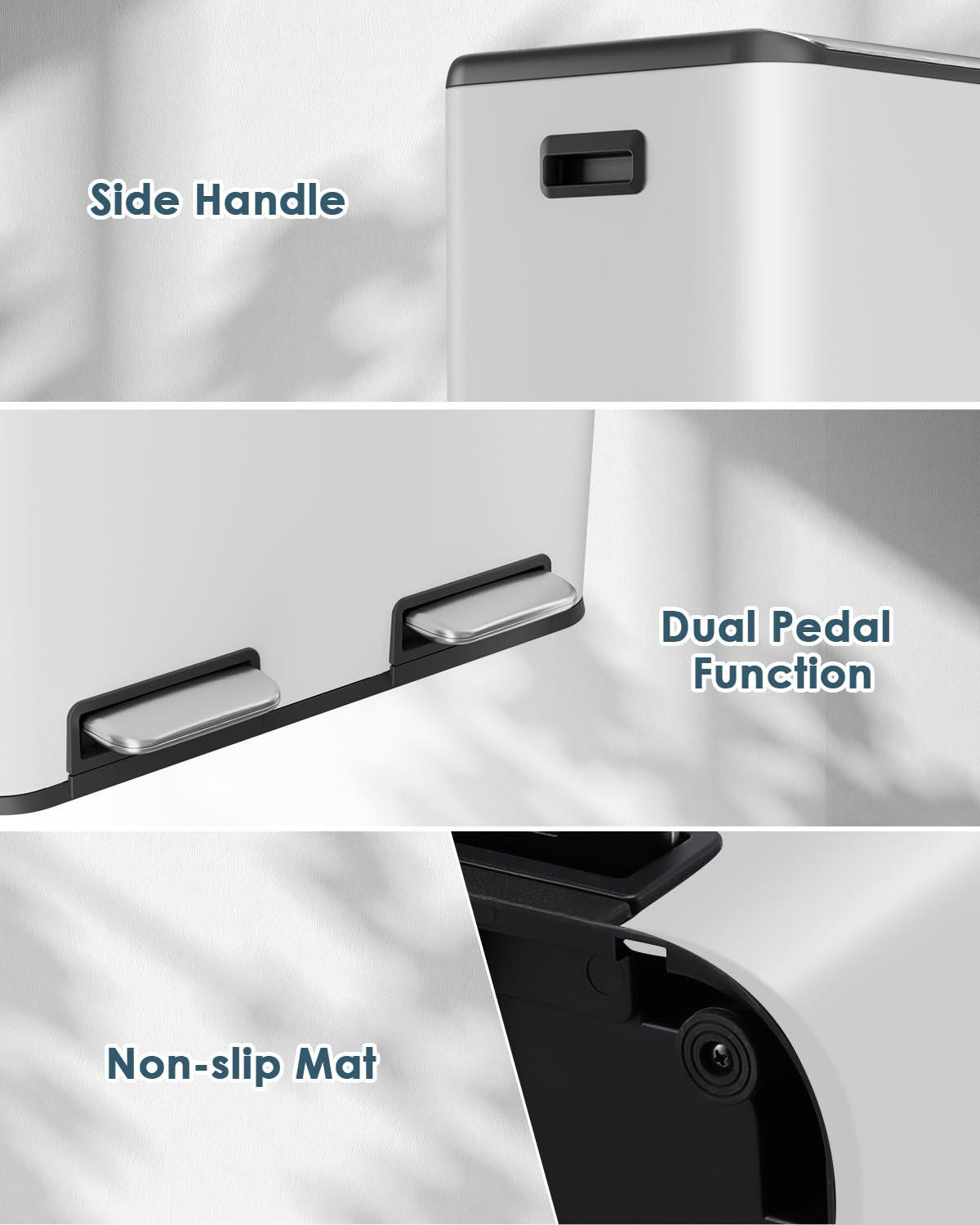 • Dual 8 gallon Compartment Bins: Trash can measures 20.3in * 14.6in * 26.2in. With a large capacity of 60 liters, it offers plenty of room for garbage and recycling, Combo garbage bin comes with two removable inner barrels, and each compartment has an independent lid and a widened pedal, which effectively isolates the smell of garbage and facilitates the opening of each compartment.