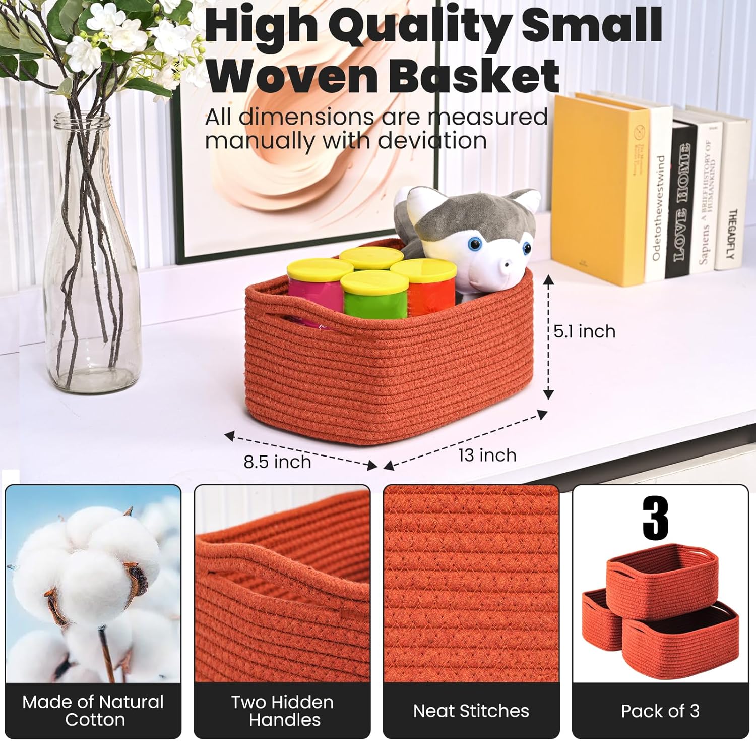 Small Red Woven Baskets for Organizing, Basket for Gifts Empty, Cotton Rope Baskets for Storage, Organizer Bins for Organization, 13"×8.5"×5.1" (3 Packs) Brick Red