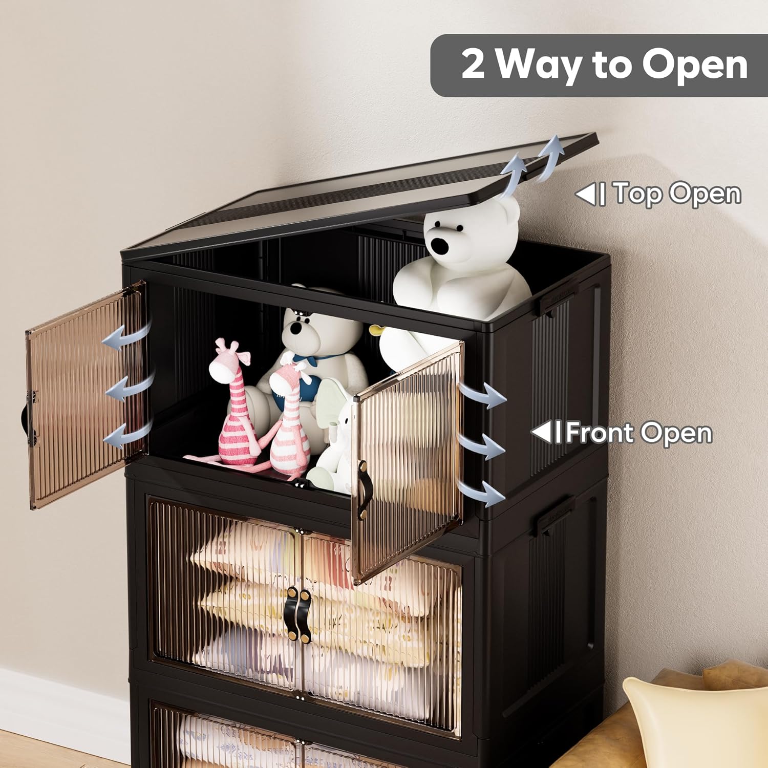 • 【Two Way Open】The bins feature front double doors or top lid openings. The magnetic lock provides easy access to the front, while the top lid allows for easy access to larger items like clothes and blankets. These bins are perfect for storage bins with drawers to enhance organization and storage.