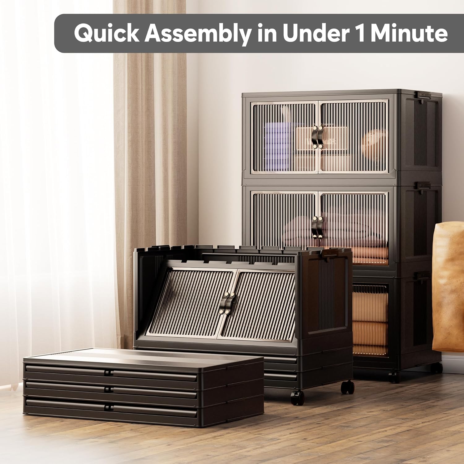 • 【Stackable & Magnetic Door & Rotating Wheels】The storage box has a groove design for stacking stackable storage bins. With side and rear buckles, the stacked boxes stay steady and secure. Equipped with four 360° rotating wheels, it’s easy to move and perfect for closet organizers and storage, keeping your space organized.