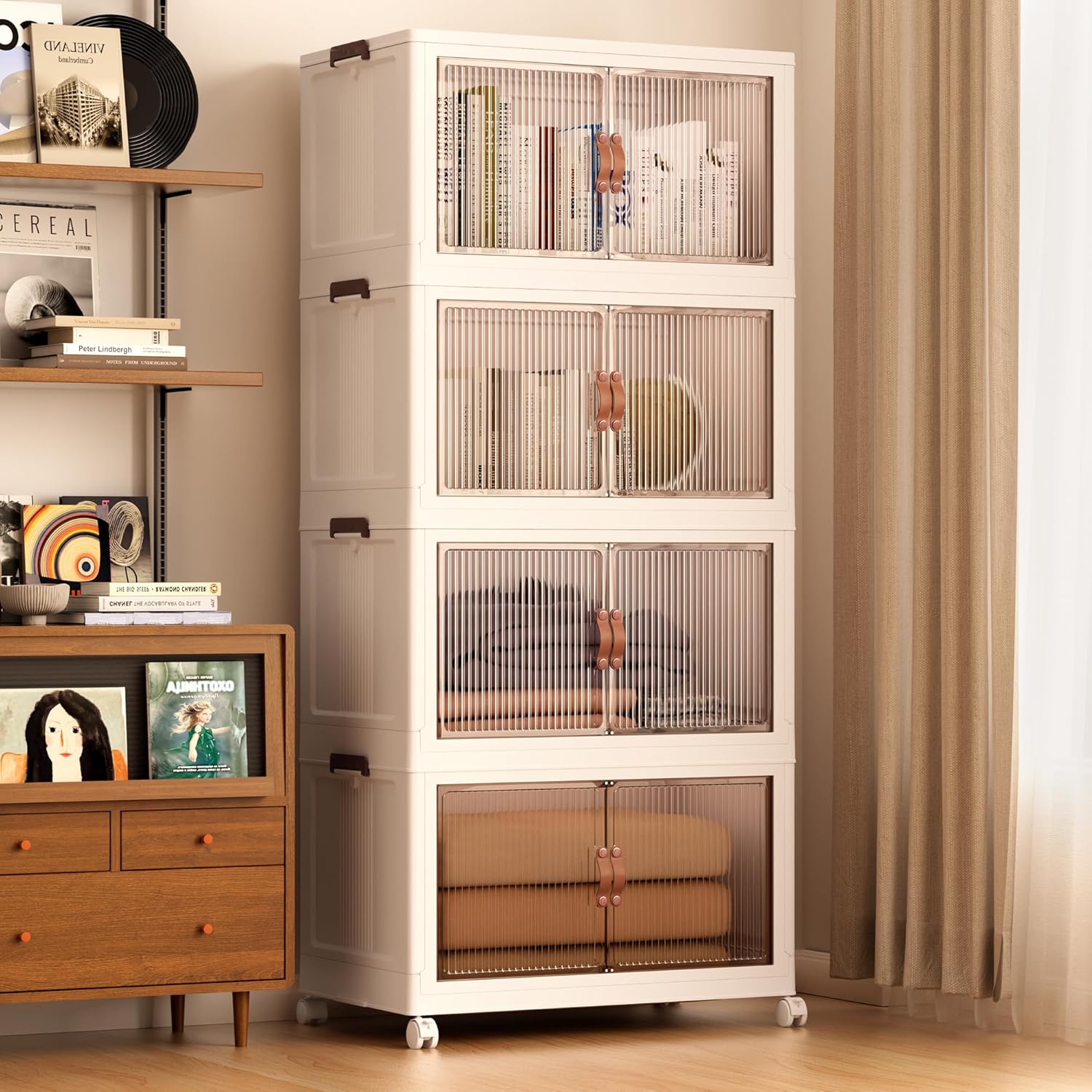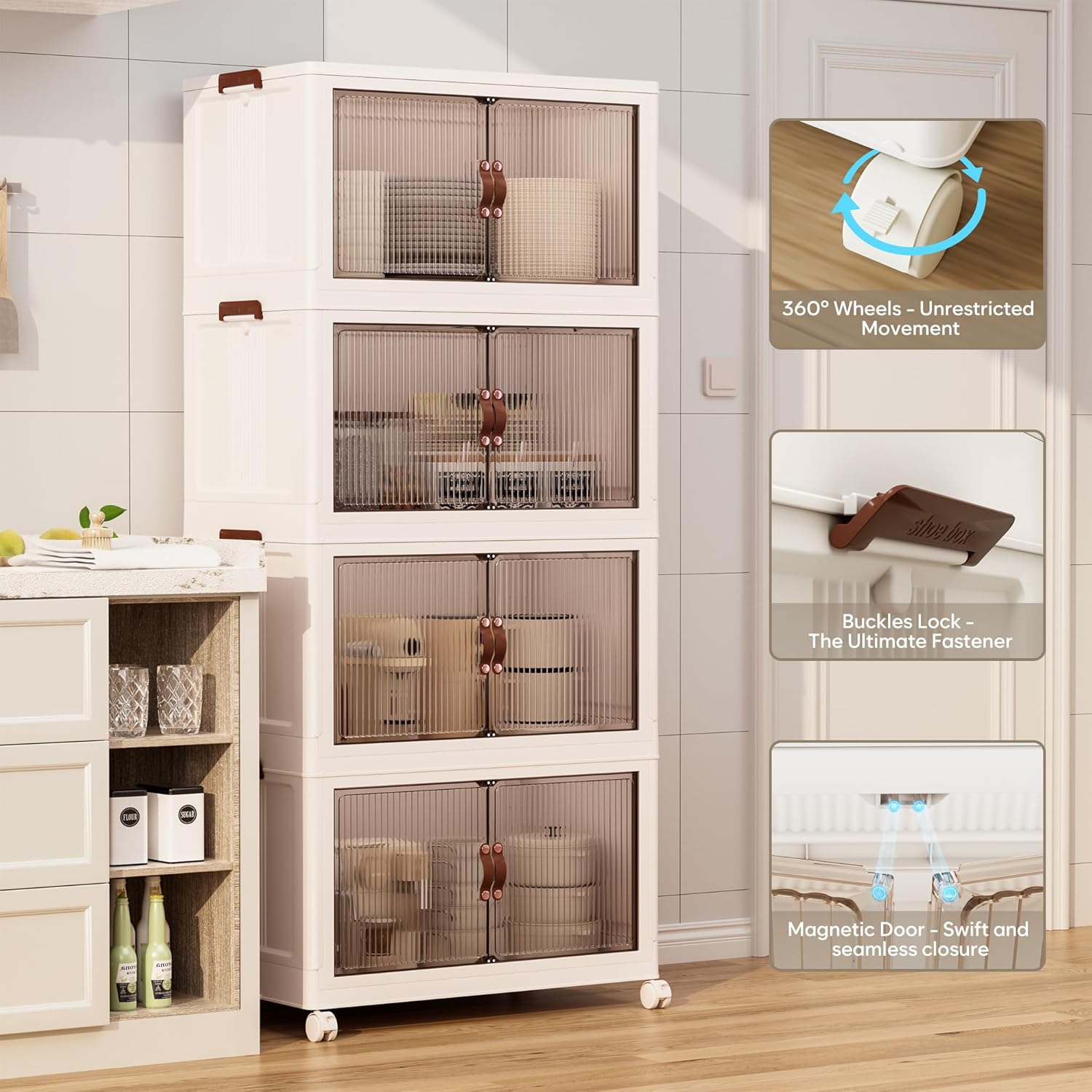 Jalove 88QT Plastic Storage Bins with lids, Stackable Collapsible Storage Containers with Wheels, Closet Organizer and Storage Drawers, Clothes Storage Cabinet for Home Office Garage, 4 Pack White