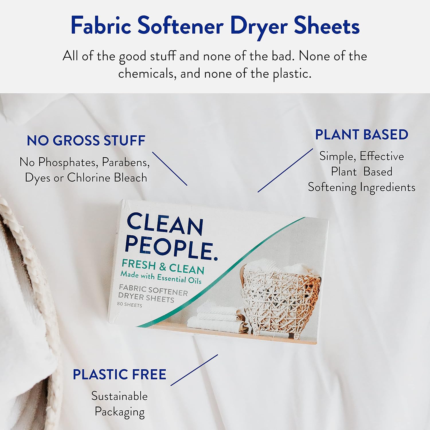 • Unlike others, our dryer sheets are scented with our signature Spring fragrance with essential oils. This amazing scent is floral and fruity with a soft musk finish, just like laundry should smell! 160 Sheets of Clean People Fabric Softener with a great Spring Scent. That's 160 soft & static free loads!