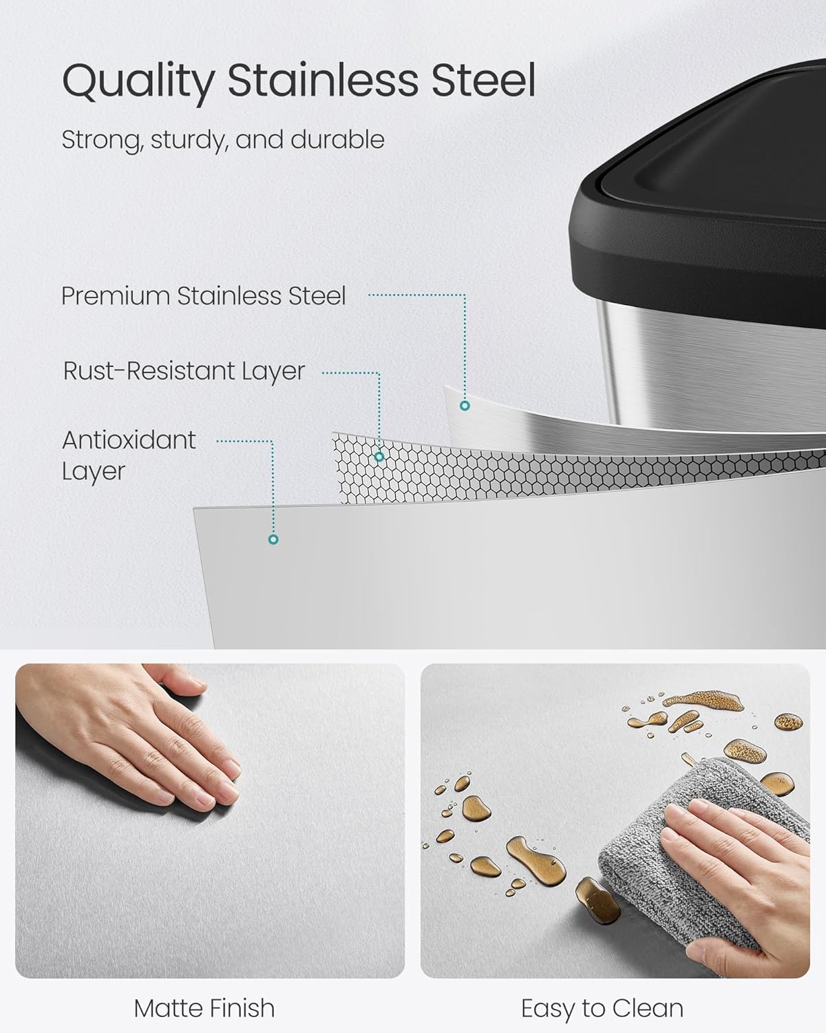• [Quality Stainless Steel] Made from stainless steel, this trash can is rust-resistant and easy to clean. It adds a stylish modern touch to any kitchen