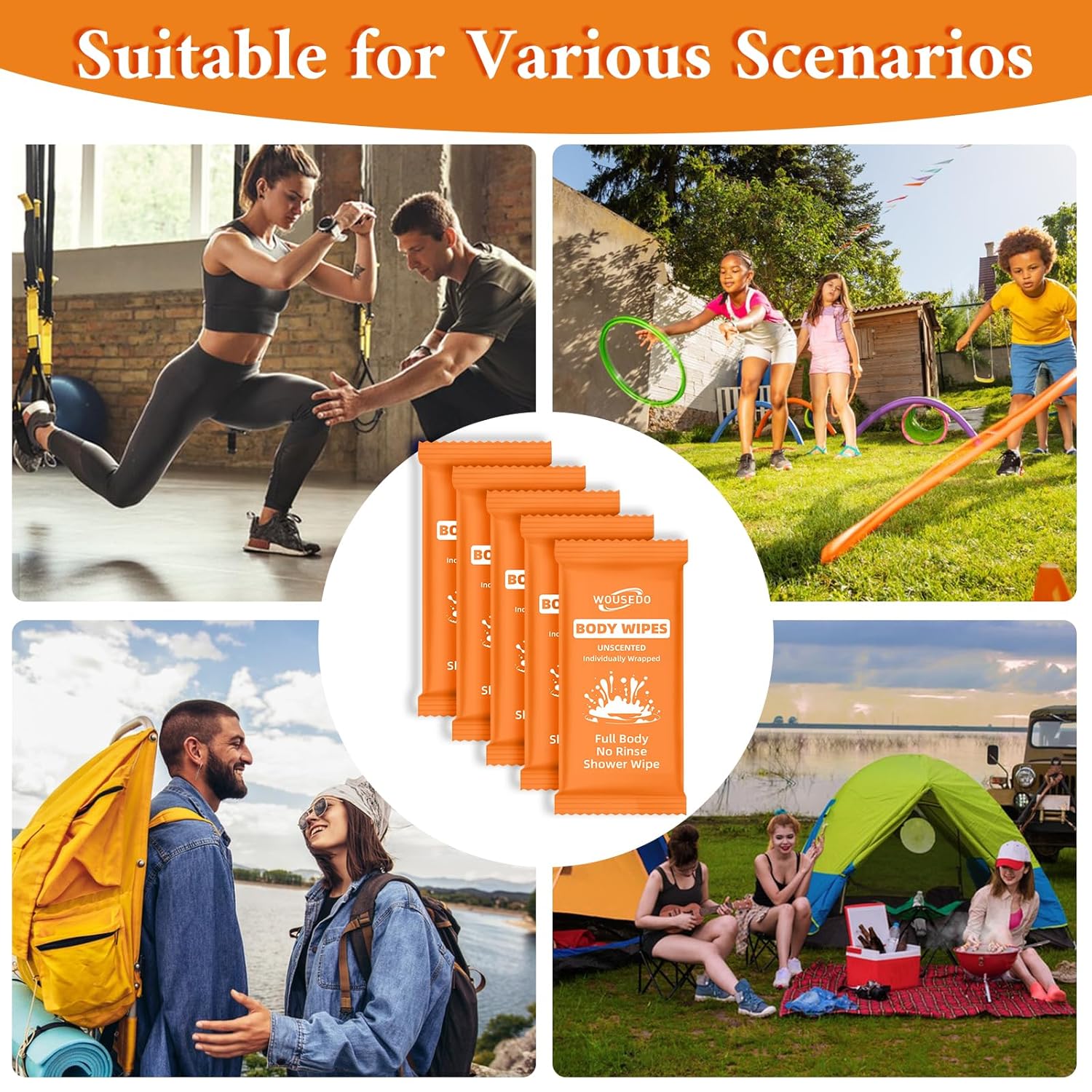 • Wide Applications: Our body wipes are suitable for all age groups and can be applied in a variety of scenarios. Whether you are traveling, camping, exercising, or just need a quick refreshment during the day, our shower wipes are always handy. They are a convenient and efficient cleaning solution that fits your active lifestyle, suitable for home, office, gym and other outdoor settings.