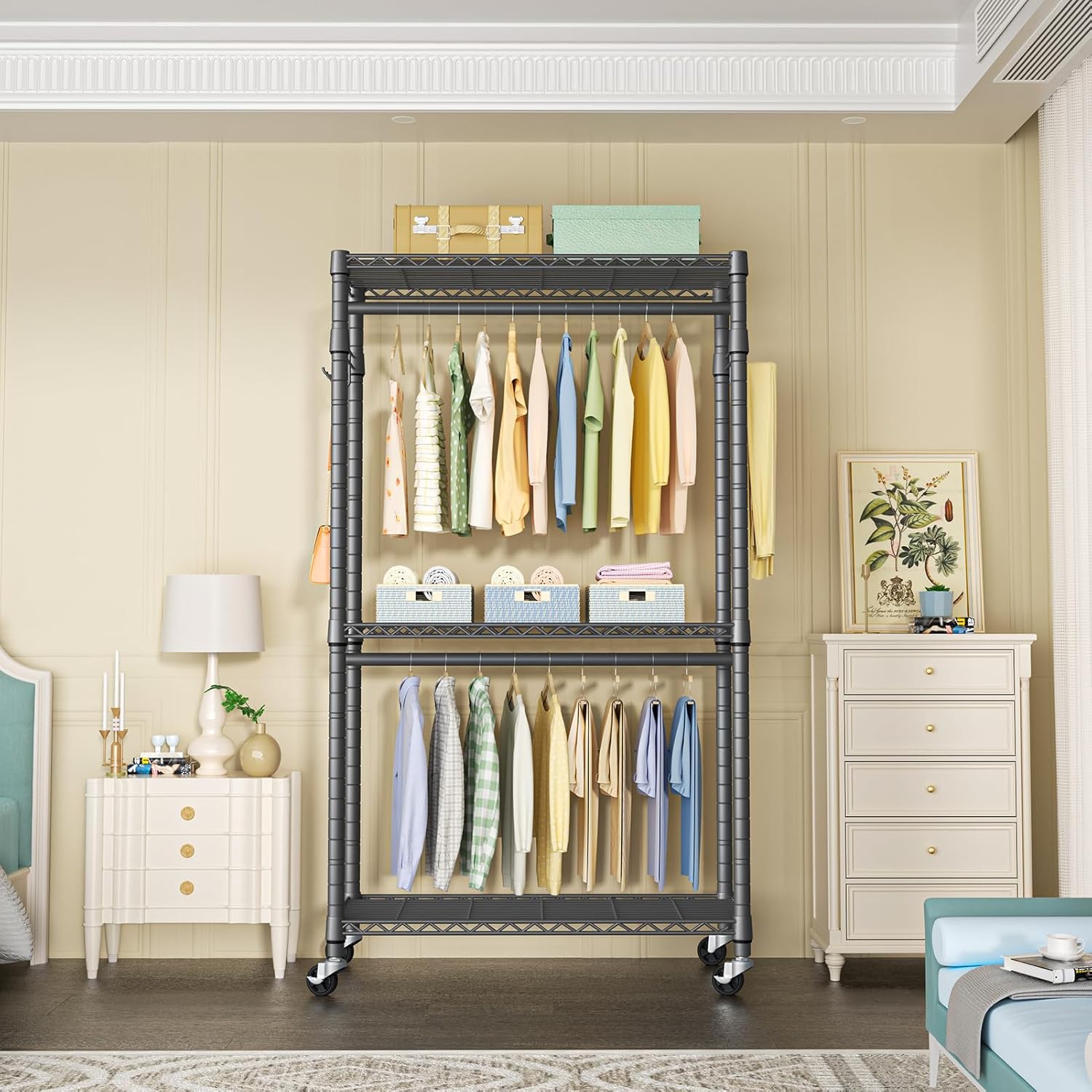 • [Portable & Lockable]: Heavy-duty garment rack meets a DIY assembly. 4 of 360° rotatable casters allow to move around at your home, and 2 of them are lockable, which can be easy to securely lock