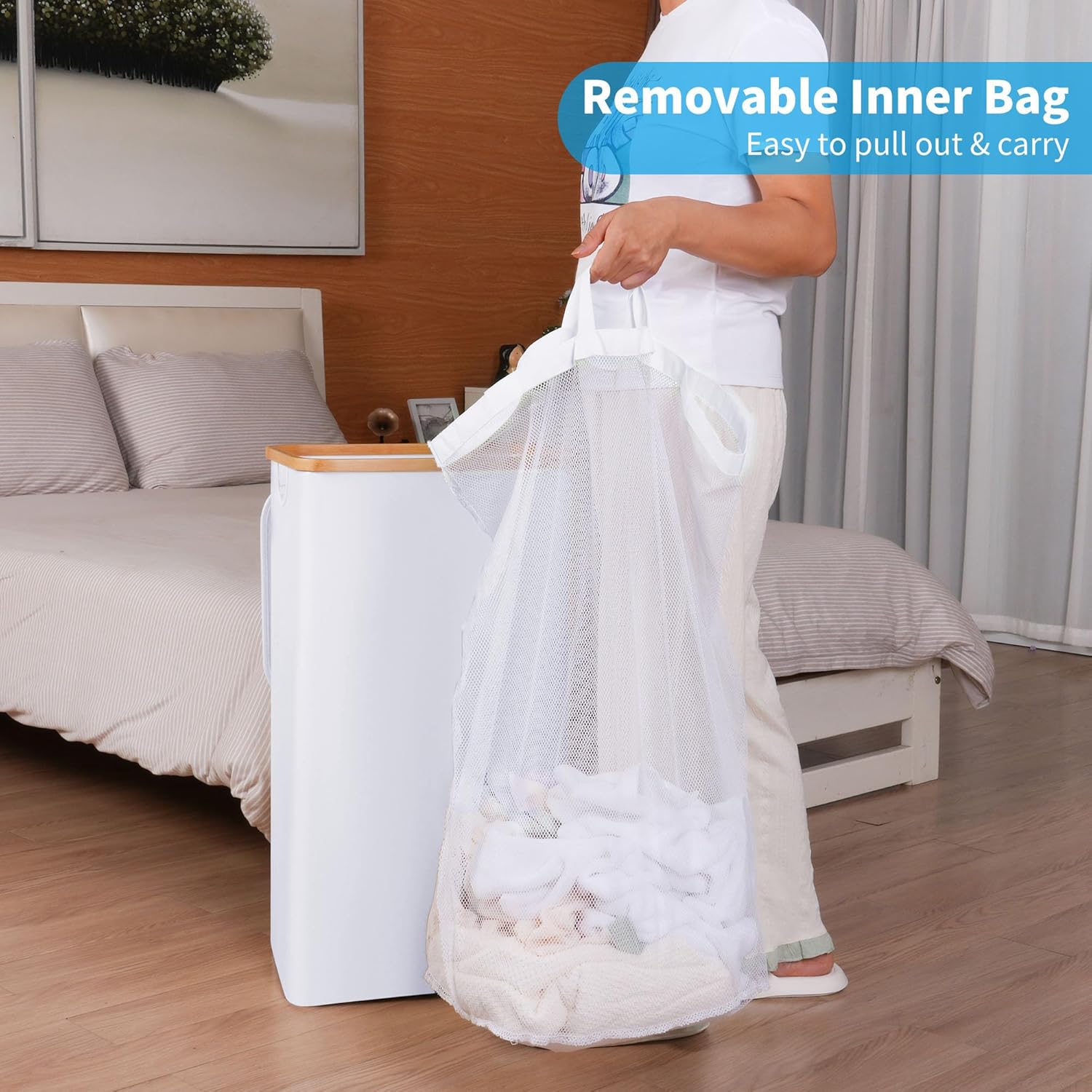efluky Laundry Hamper with Lid, 100L Tall Laundry Basket with Bamboo Handles for Clothes and Toys, Collapsible Laundry Hamper with Inner Bag for Bedroom and Bathroom, White
