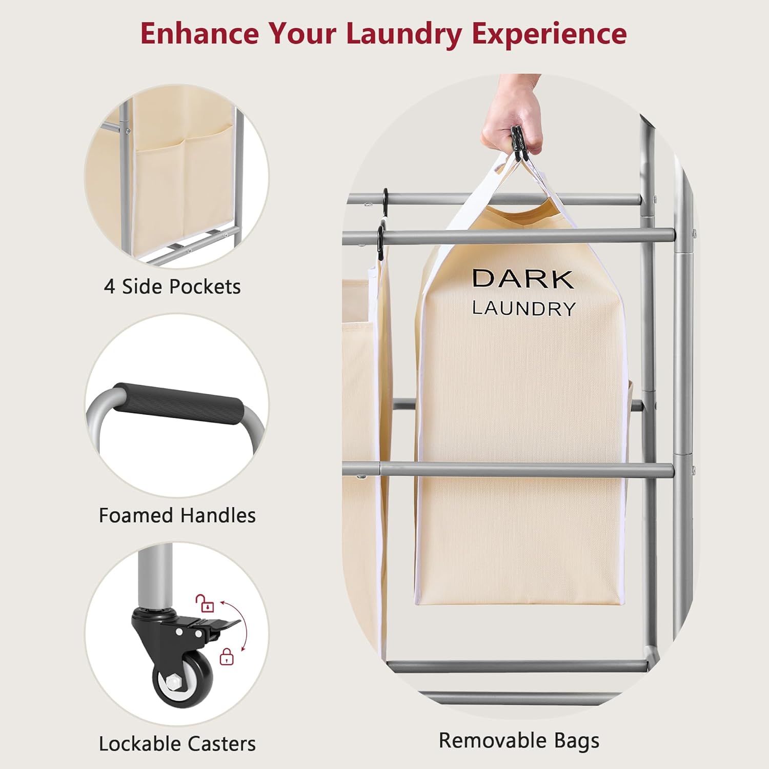 • 【Removable Laundry Bags】The laundry hamper with wheels comes with 5 laundry bags to sort your clothes by color or type, simply use the two metal handles to remove the laundry bags individually from the laundry sorter cart.